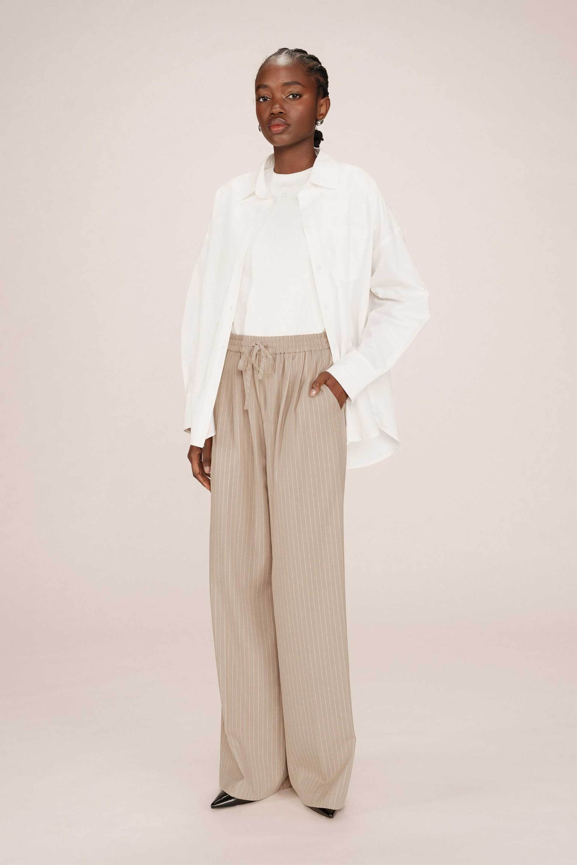 Γυναικείο παντελόνι. Ελαστική μέση με κορδόνι. Τσέπες στο πλάι. Ριγέ σχέδιο. Straight leg. Wide leg. Προέλευση: CN. 64% polyester, 34% βισκόζη, 2% elastane Το μοντέλο έχει ύψος περίπου 172 cm και φοράει μέγεθος S. ΑΙΣΑΚΟΣ Α.Ε.
