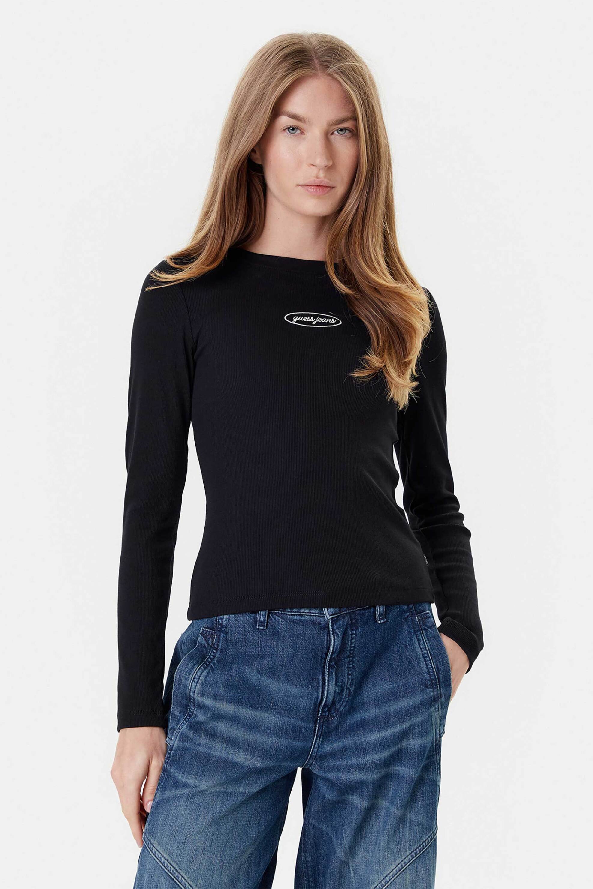 Γυναικεία ribbed μπλούζα. Στρογγυλή λαιμόκοψη. Μακρύ μανίκι. Λογότυπο στο μπροστινό μέρος. Slim fit. Προέλευση: Μπανγκλαντές. 98% βαμβάκι, 2% elastane SHOP & TRADE AEBE