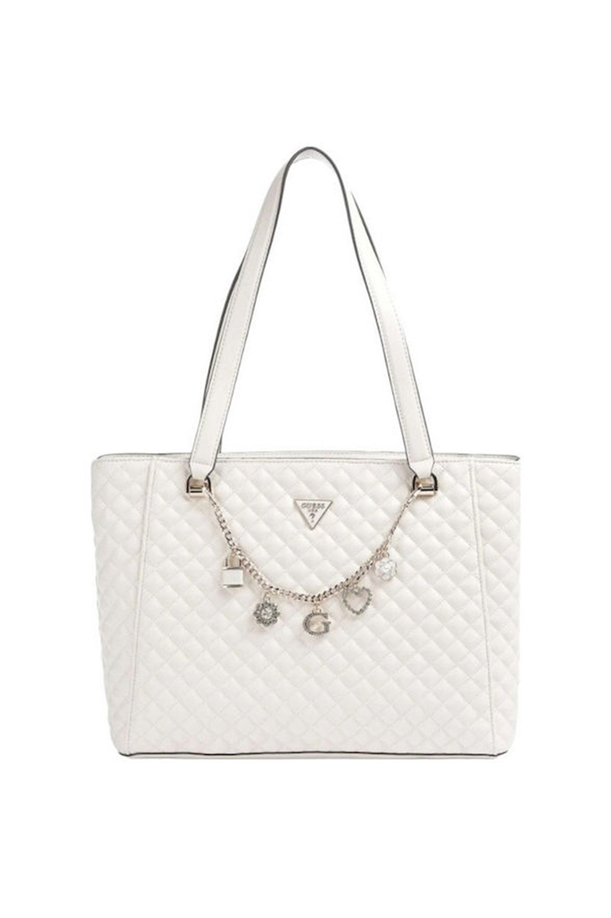 Γυναικεία τσάντα tote. Αλυσίδα με charm λογότυπο και διακοσμητικό κόσμημα. Μεταλλικό τριγωνικό λογότυπο. Kλείσιμο με φερμουάρ. Διαστάσεις: 31/36 x 26 x 7 cm. Προέλευση: Κίνα. 100% polyurethane SHOP & TRADE AEBE