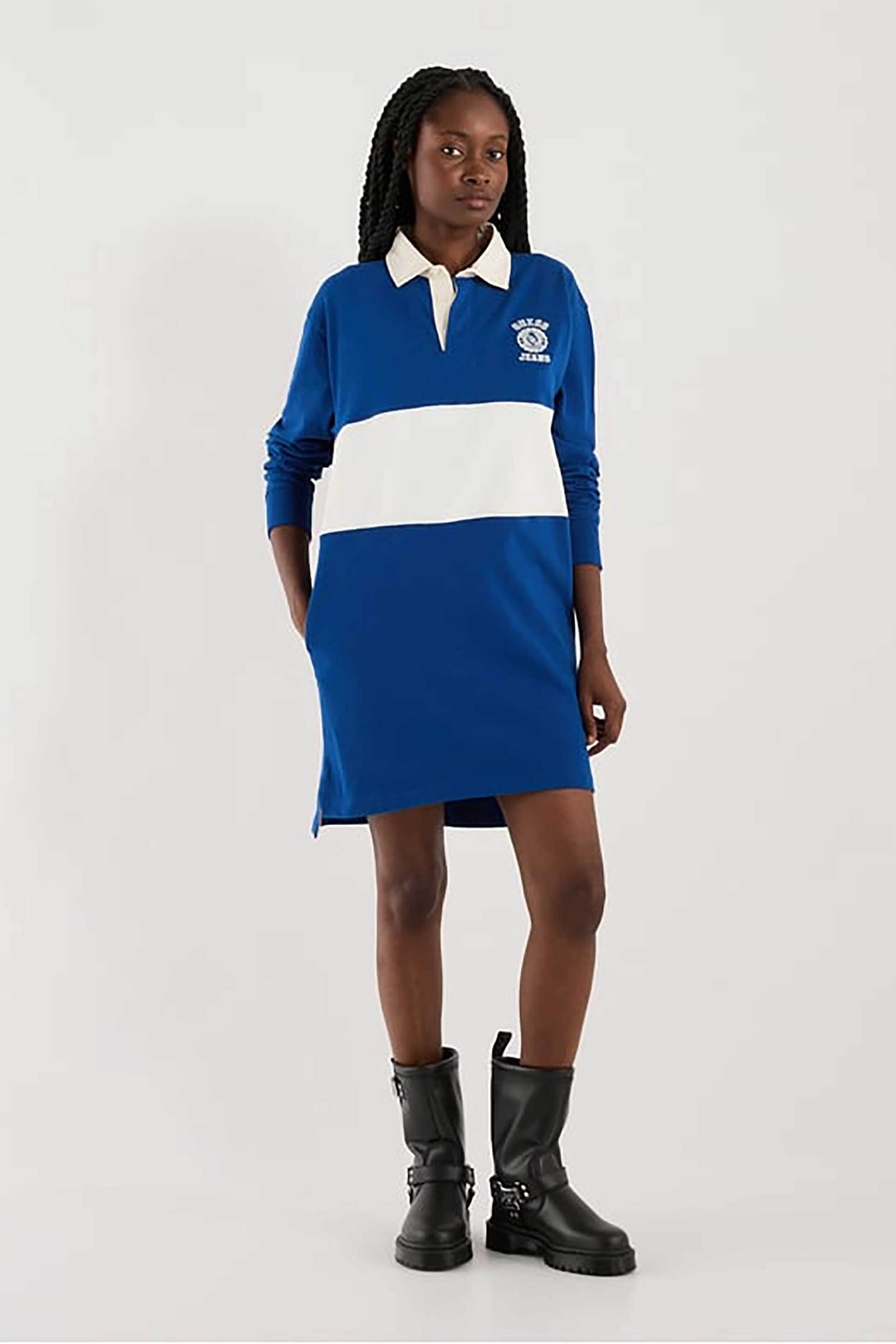 Γυναικείο φόρεμα mini. Πόλο γιακάς. Λογότυπο στο στήθος. Πατιλέτα με κουμπιά. Μακρύ μανίκι. Ριγέ σχέδιο. Προέλευση: Ινδία. 100% βαμβάκι SHOP & TRADE AEBE