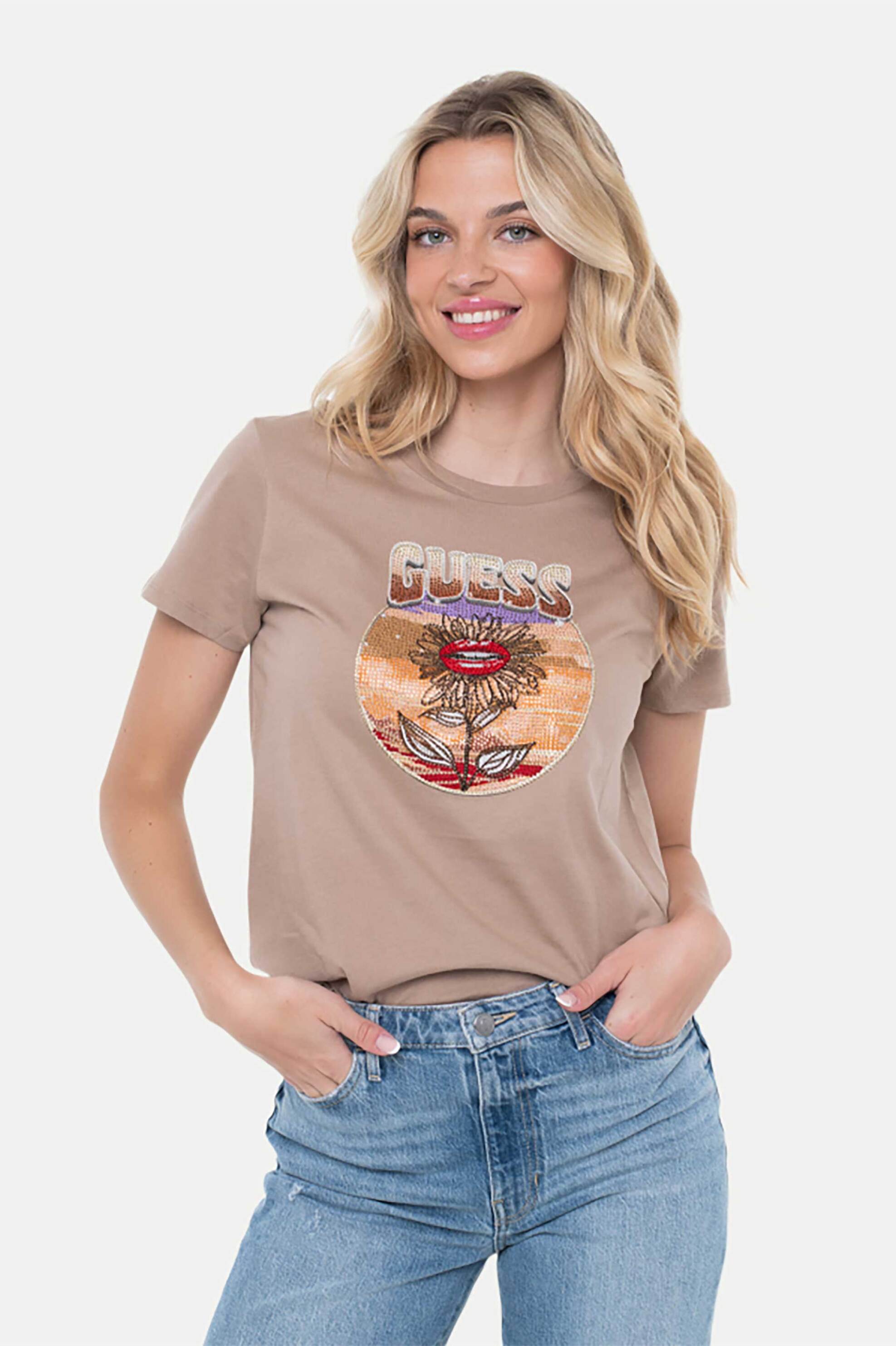 Γυναικείο T-shirt. Floral σχέδιο. Ανάγλυφο λογότυπο. Στρογγυλή λαιμόκοψη. Regular fit. Προέλευση: Ινδία. 100% βαμβάκι SHOP & TRADE AEBE