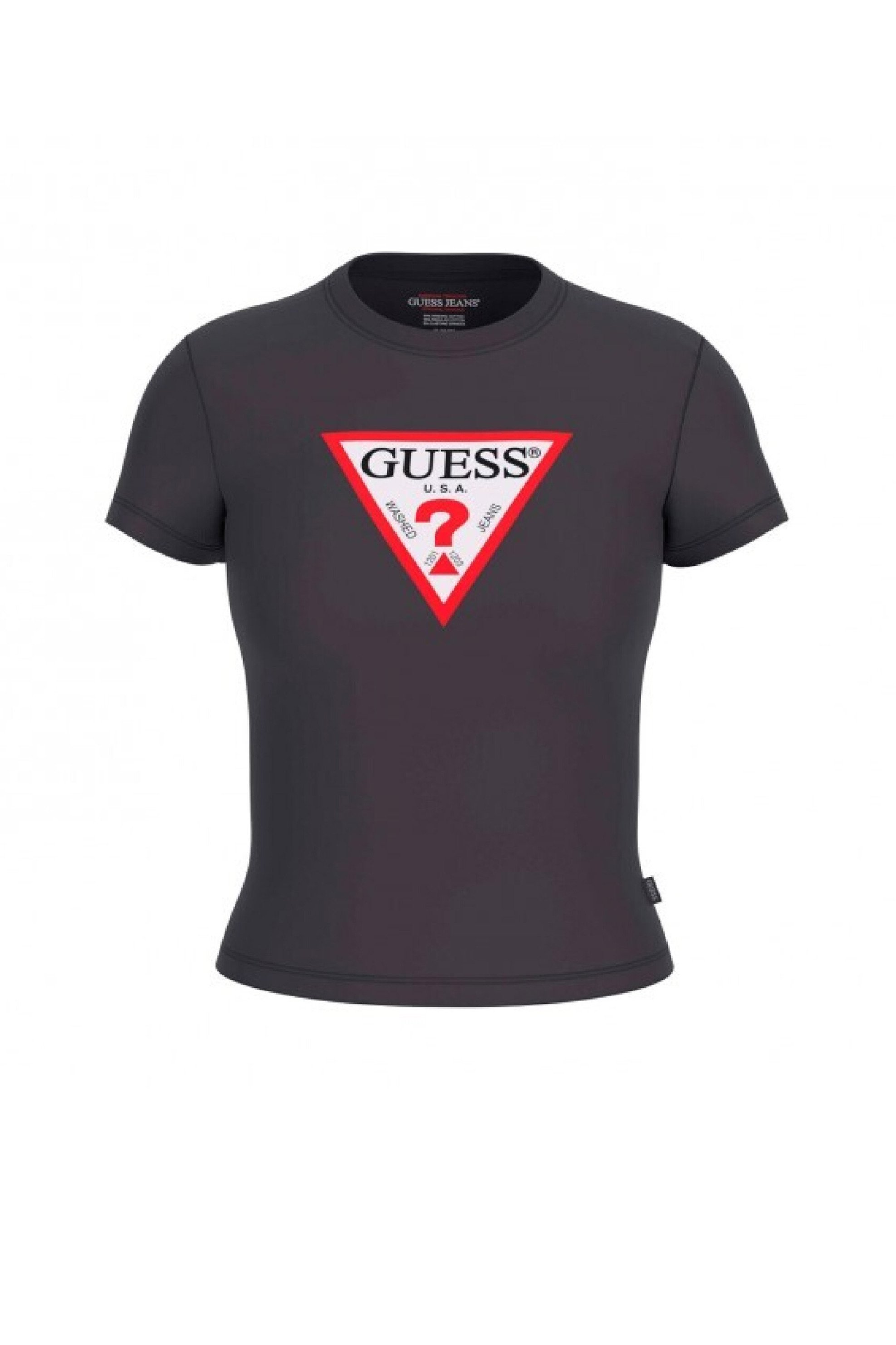 Γυναικείο T-shirt. Μονόχρωμο. Στρογγυλή λαιμόκοψη. Κοντό μανίκι. Τριγωνικό λογότυπο μπροστά. 95% βαμβάκι, 5% elastane SHOP & TRADE AEBE