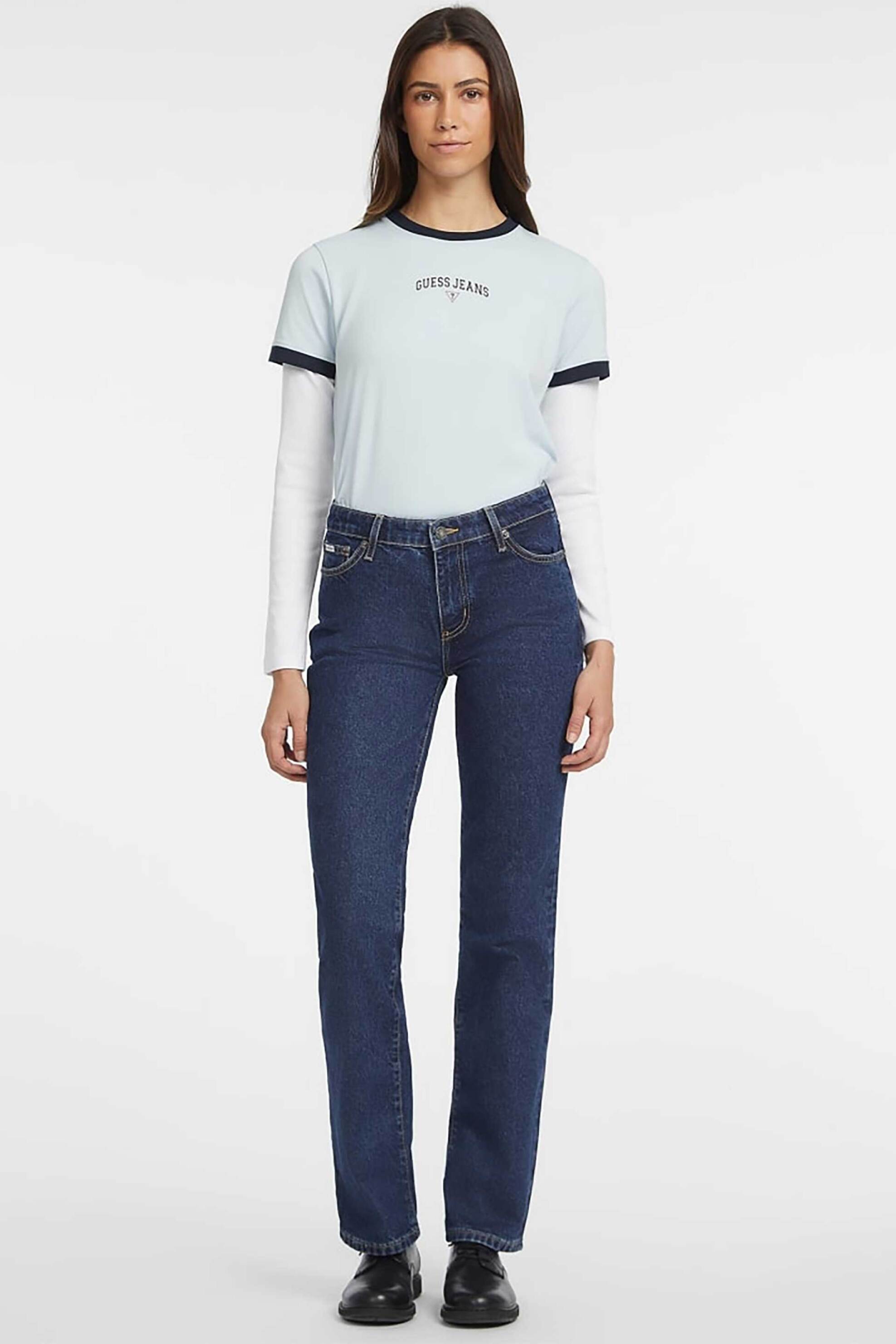 Γυναικείο τζιν παντελόνι. Πεντάτσεπο. Θηλιές για ζώνη. Logo patch στο πίσω μέρος. Κλείσιμο με φερμουάρ και κουμπί. Straight fit. Προέλευση: Πακιστάν. 98% βαμβάκι, 2% elastane SHOP & TRADE AEBE