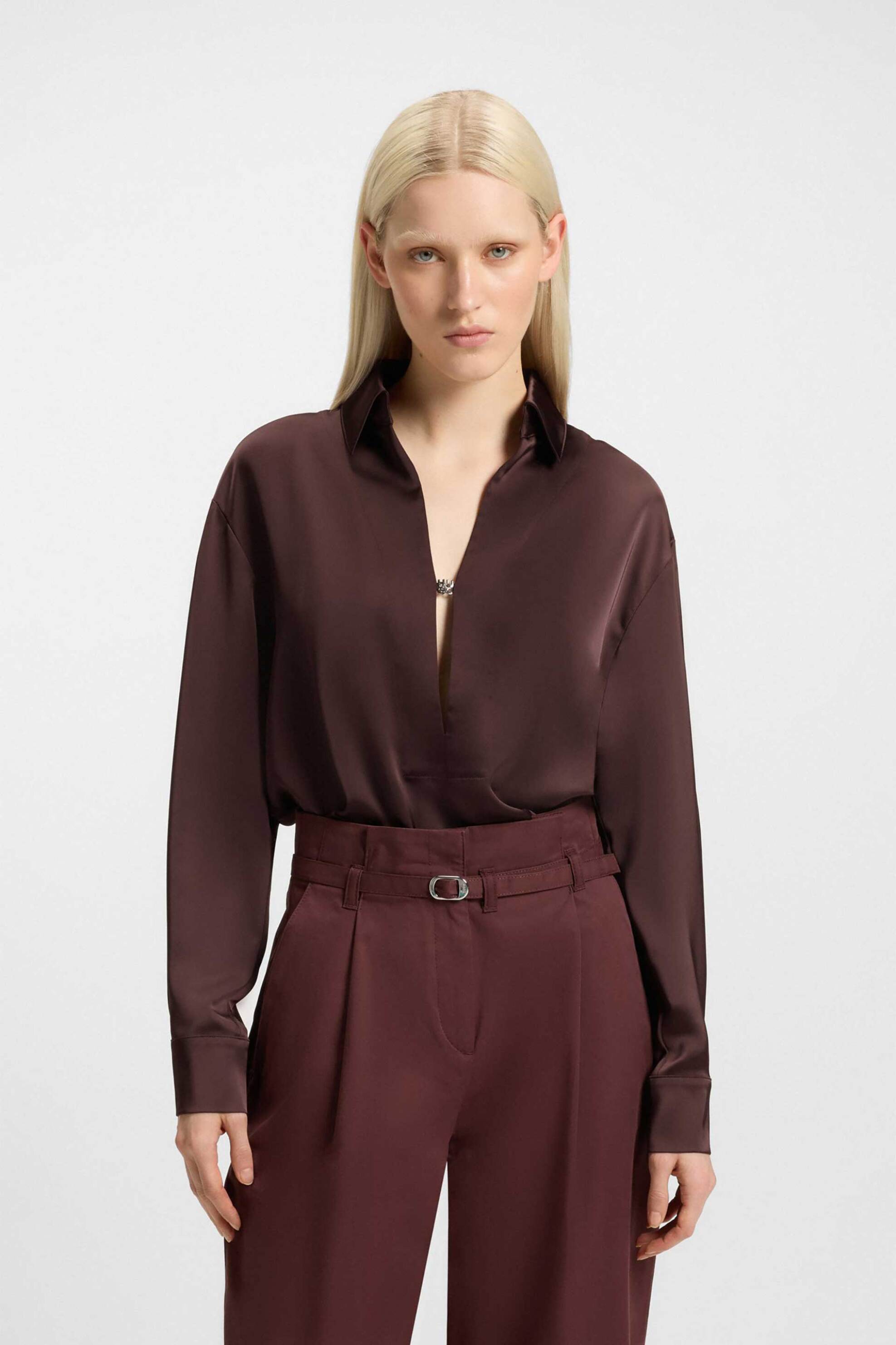 Γυναικεία μπλούζα. V λαιμόκοψη με μεταλλικό κούμπωμα. Μακρύ μανίκι. Relaxed fit. 100% polyester Το μοντέλο έχει ύψος 180 cm και φοράει νούμερο 36. HUGO BOSS HELLAS ΕΠΕ