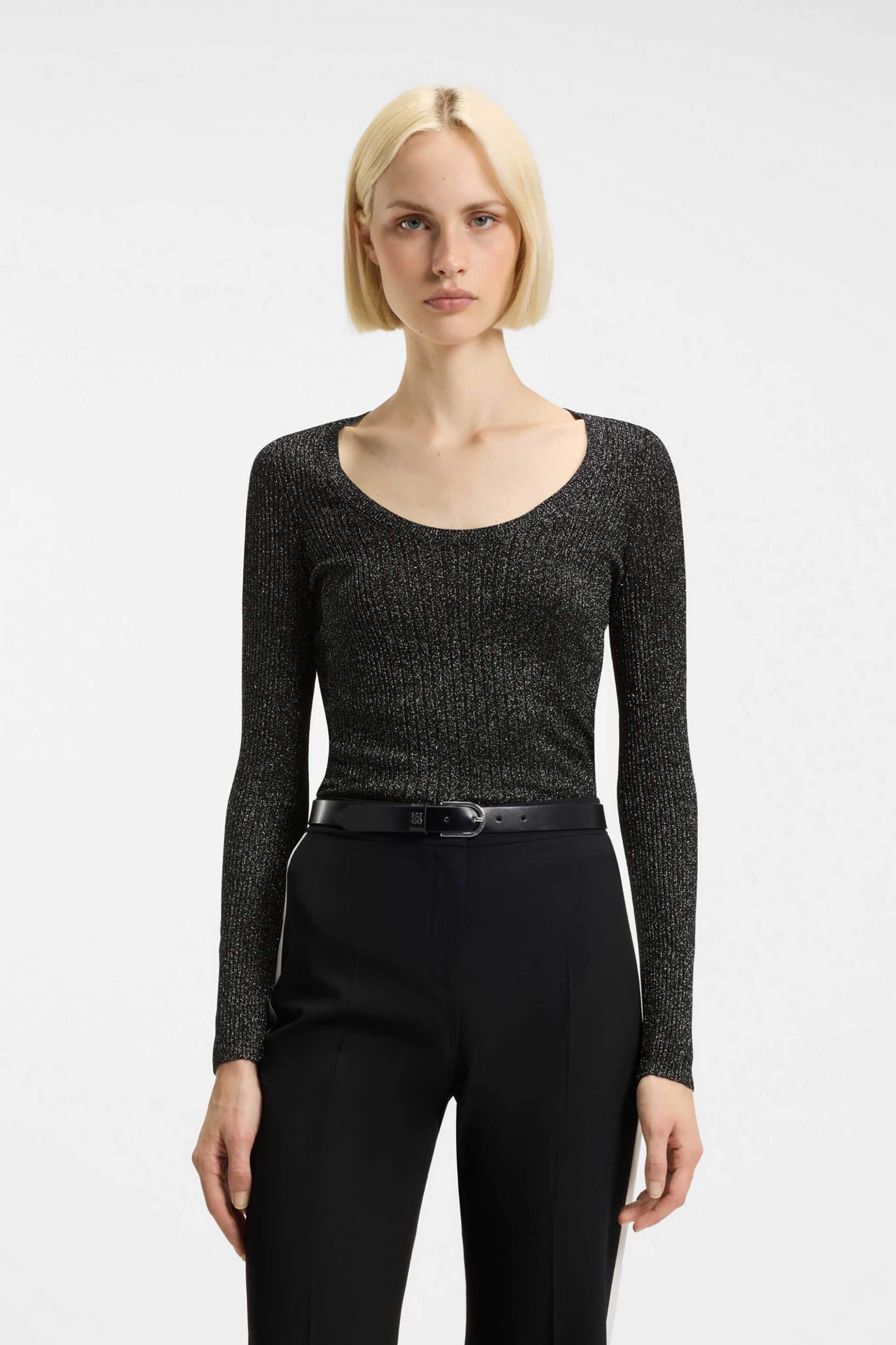 Γυναικεία μπλούζα. Στρογγυλή λαιμόκοψη. Μακρύ μανίκι. Ribbed. Slim fit. 89% βισκόζη, 11% polyester Το μοντέλο έχει ύψος 175 cm και φοράει νούμερο S. HUGO BOSS HELLAS ΕΠΕ