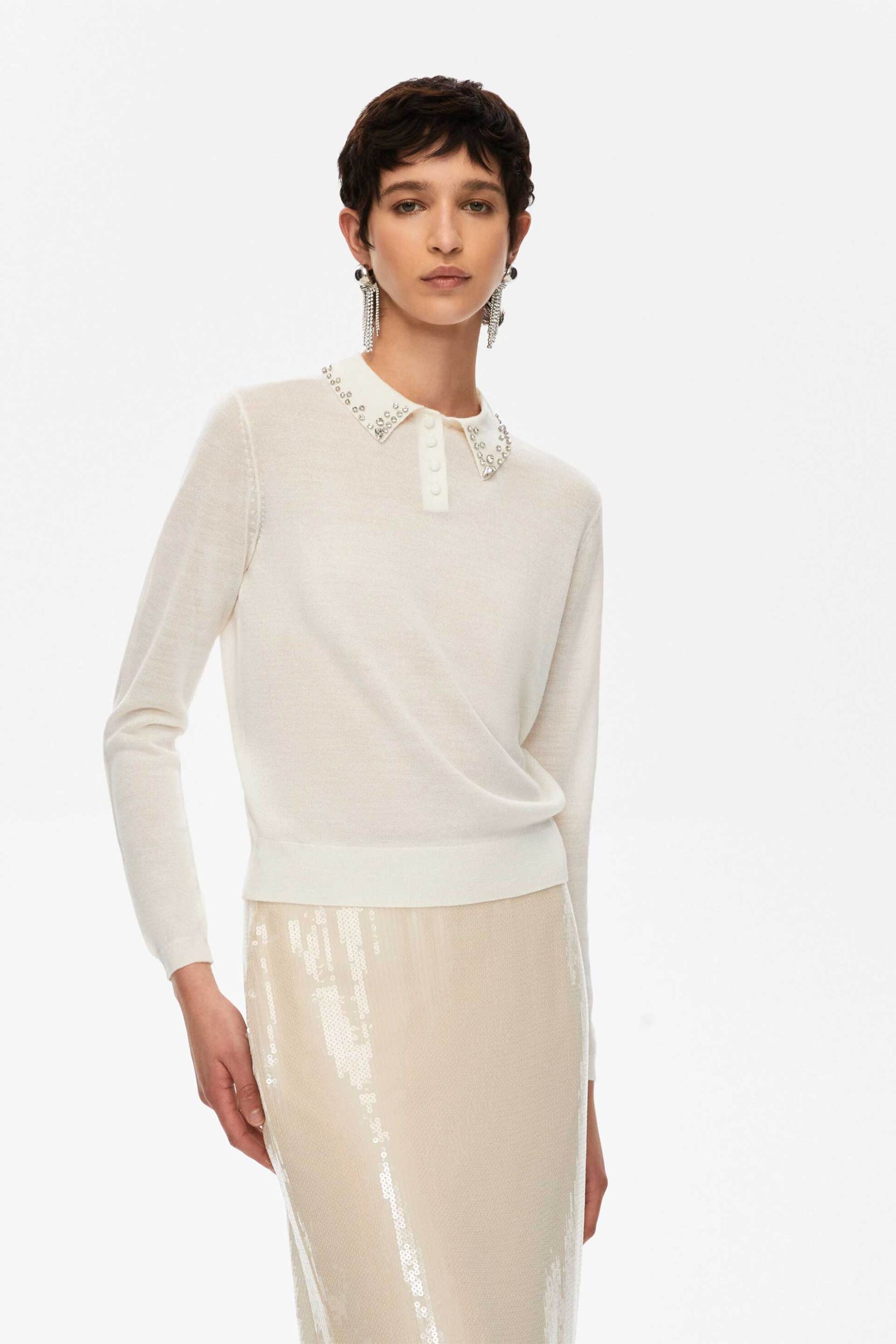 Γυναικεία πλεκτή μπλούζα. Πόλο γιακάς με διακοσμητικά στρας. Μακρύ μανίκι. Slim fit. Προέλευση: CN. 50% μαλλί, 50% acrylic DEDIMAX SRLU