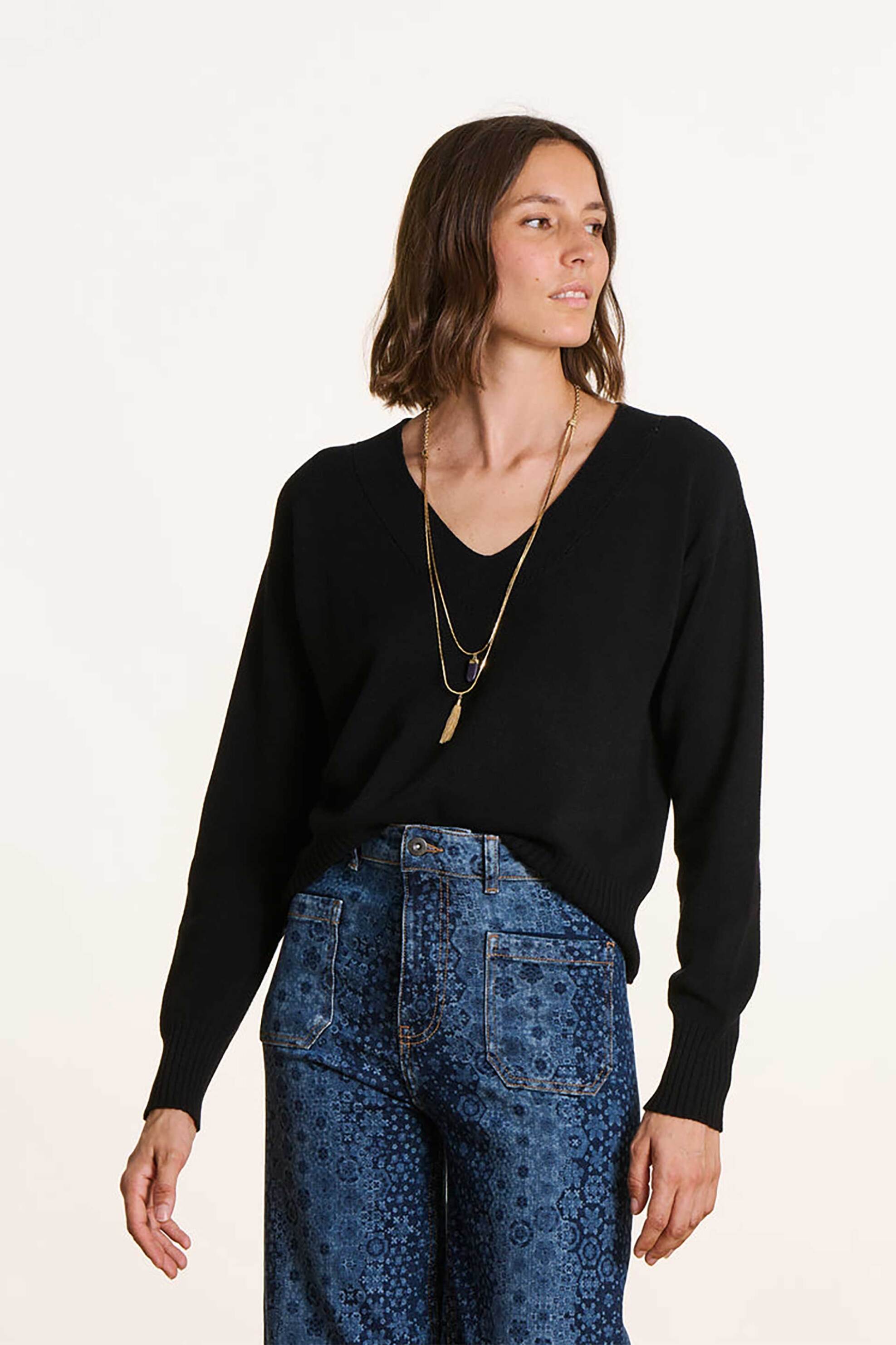 Γυναικεία πλεκτή μπλούζα. V λαιμόκοψη. Μακρύ μανίκι. Διάτρητο σχέδιο στη λαιμόκοψη. Προέλευση: ΙΤ. 50% βισκόζη, 30% polyamide, 20% μαλλί S.A.S. U LA FEE