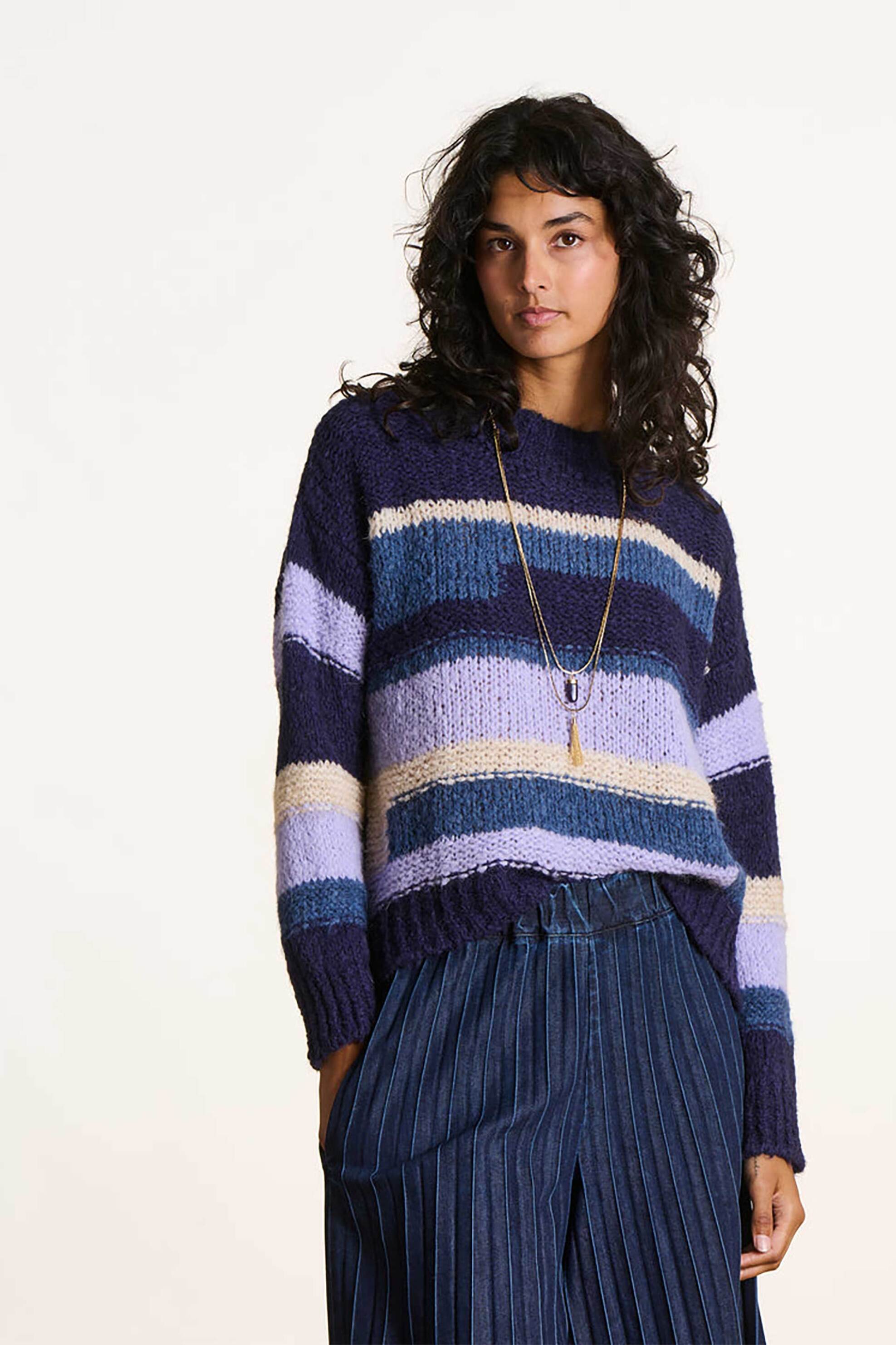 Γυναικείο πουλόβερ. Ριγέ σχέδιο. Στρογγυλή λαιμόκοψη. Μακρύ μανίκι. Προέλευση: ΙΤ. 60% acrylic, 20% moher, 10% polyamide, 10% μαλλί S.A.S. U LA FEE