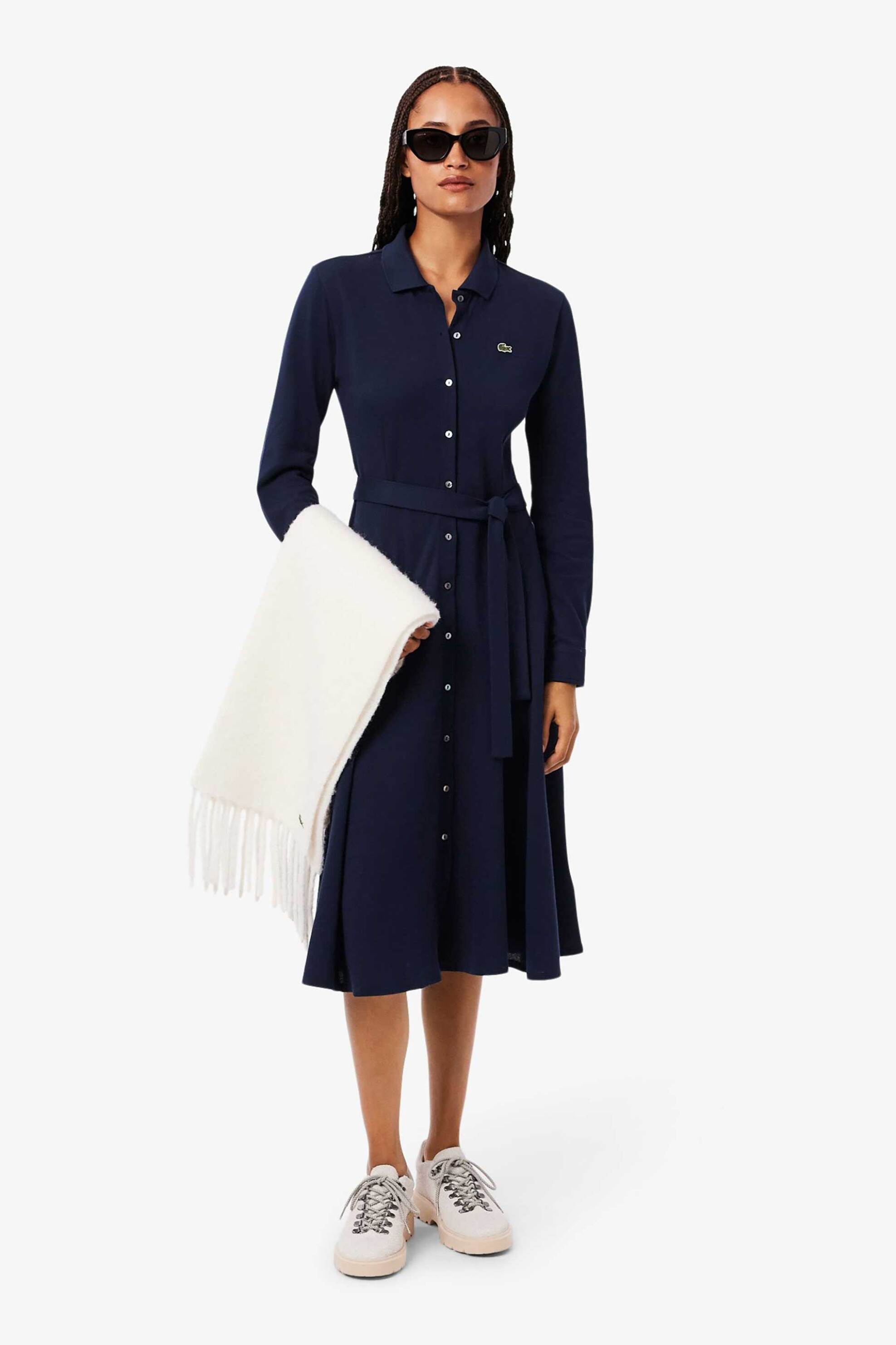 Γυναικείο midi φόρεμα πόλο. Σεμιζιέ. Πικέ ύφανση. Μονόχρωμο. Κεντημένο λογότυπο στο στήθος. Ζώνη στη μέση. Μακρύ μανίκι. Flared fit. Προέλευση: Μαρόκο. 100% βαμβάκι Sustainable: προϊόν που έχει κατασκευαστεί με ίνες ή/και διαδικασίες βιώσιμης παραγωγής, μειώνοντας το περιβαλλοντικό αποτύπωμα. Για ε...