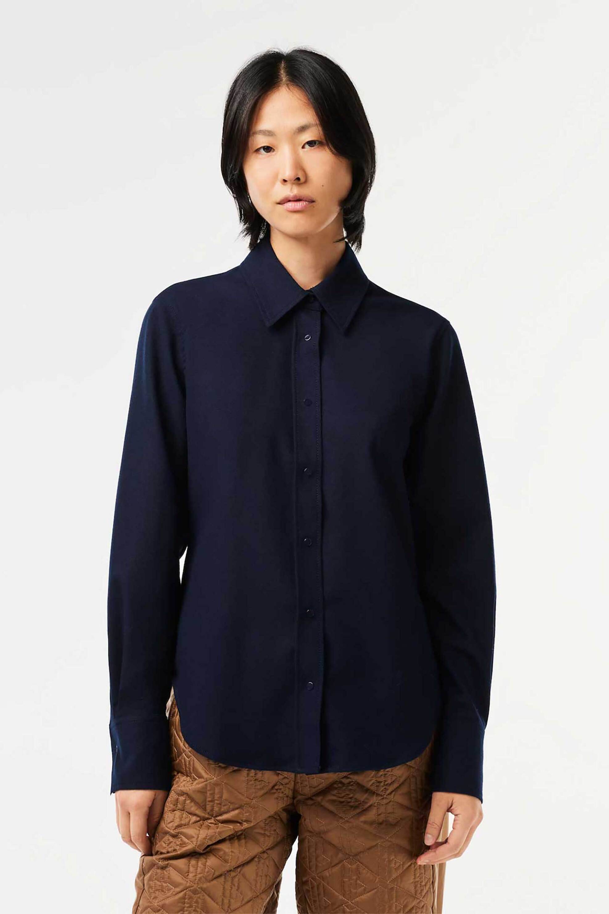 Γυναικείο πουκάμισο. Μονόχρωμο. Κεντημένο λογότυπο στη μνασέτα. Μακρύ μανίκι. Slim fit. 68% polyester, 29% rayon, 3% elastane