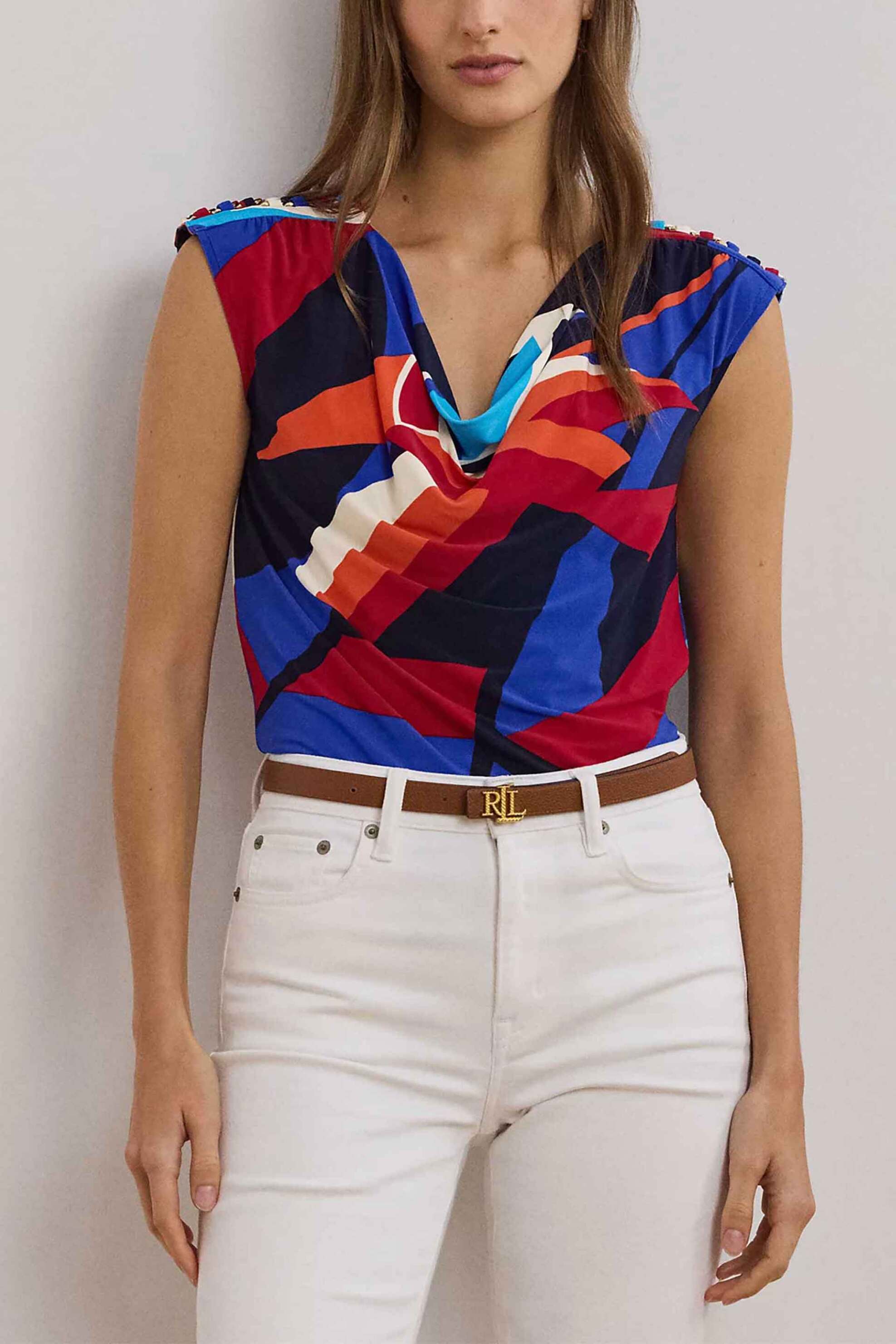 Γυναικεία μπλούζα. Ντραπέ λαιμόκοψη. Αμάνικο. Εμπριμέ σχέδιο. Relaxed fit. Προέλευση: Φιλιππίνες. 95% recycled polyester, 5% elastane Το μοντέλο έχει ύψος 178 cm και φοράει μέγεθος S. Sustainable: προϊόν που έχει κατασκευαστεί με ίνες ή/και διαδικασίες βιώσιμης παραγωγής, μειώνοντας το περιβαλλοντι...