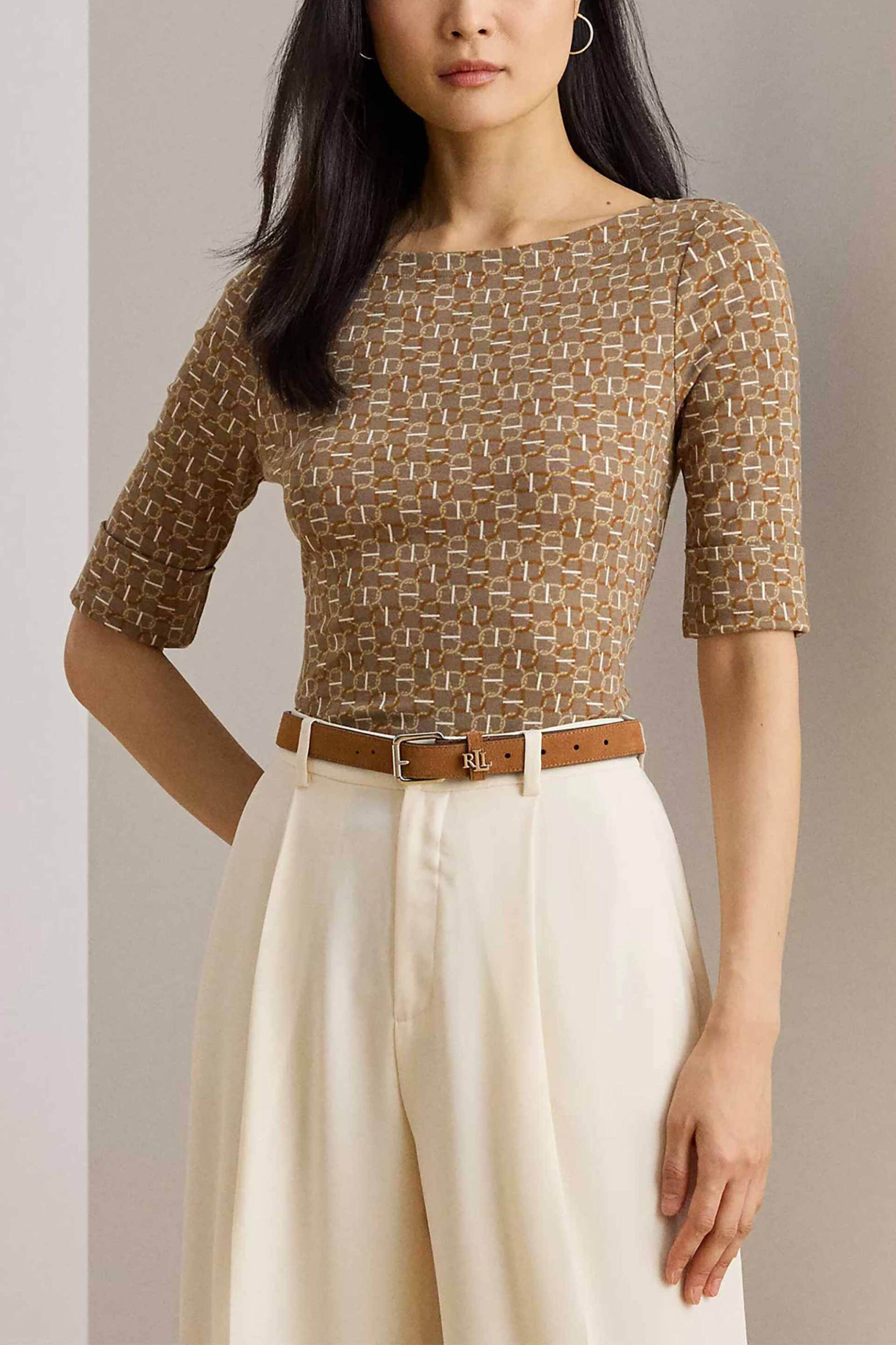 Γυναικεία μπλούζα. Geometrical print. Boat λαιμόκοψη. Κοντό μανίκι με ρεβέρ. Slim fit. 94% βαμβάκι, 6% elastane Το μοντέλο έχει ύψος 178 cm και φοράει μέγεθος S. Sustainable: προϊόν που έχει κατασκευαστεί με ίνες ή/και διαδικασίες βιώσιμης παραγωγής, μειώνοντας το περιβαλλοντικό αποτύπωμα. Για επικ...