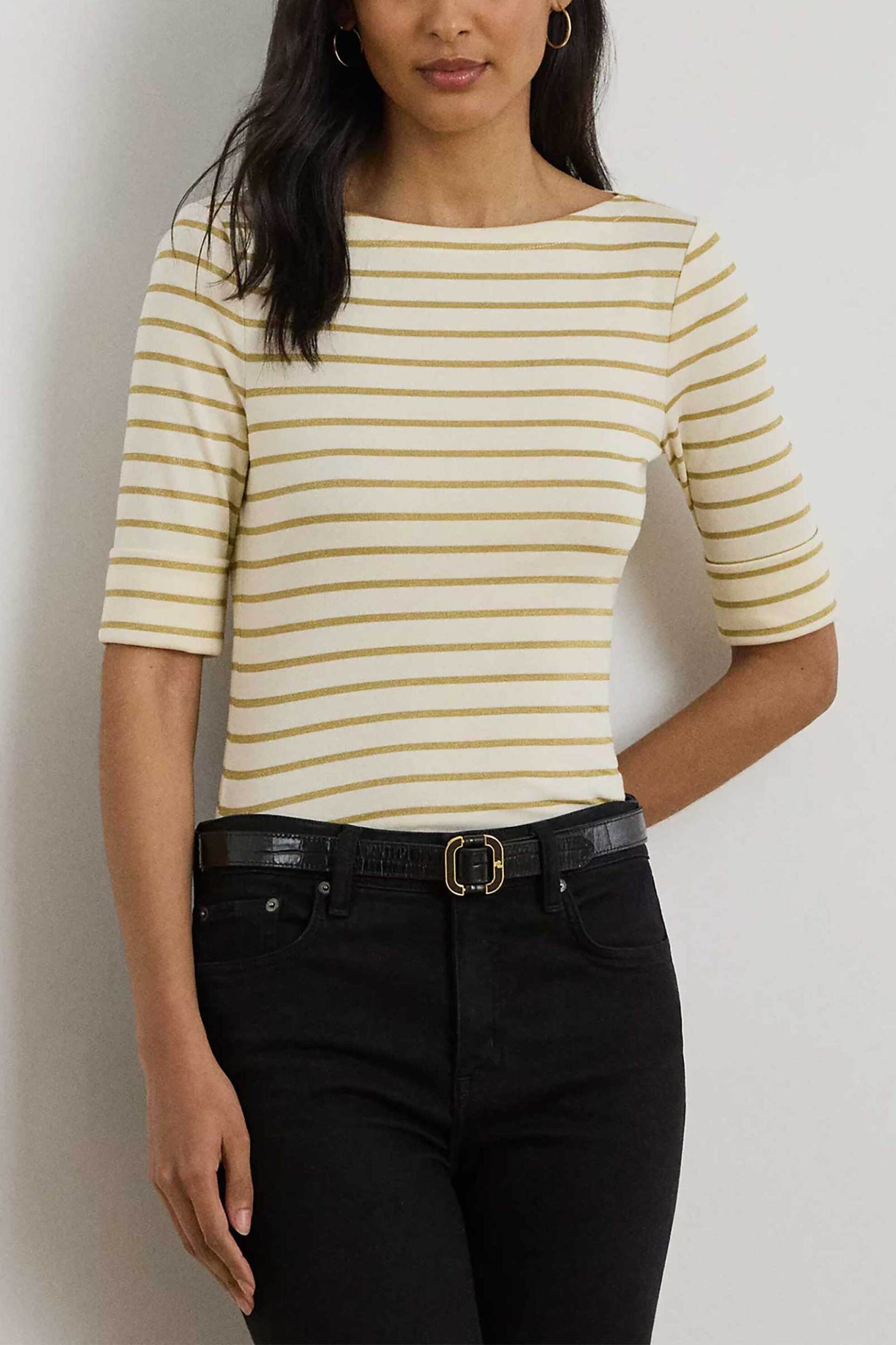 Γυναικεία μπλούζα. Ριγέ σχέδιο. Boat λαιμόκοψη. Κοντό μανίκι με ρεβέρ. Slim fit. 75% βαμβάκι, 10% nylon, 8% elastane, 7% μεταλλικές ίνες Το μοντέλο έχει ύψος 178 cm και φοράει μέγεθος S. Sustainable: προϊόν που έχει κατασκευαστεί με ίνες ή/και διαδικασίες βιώσιμης παραγωγής, μειώνοντας το περιβαλλο...
