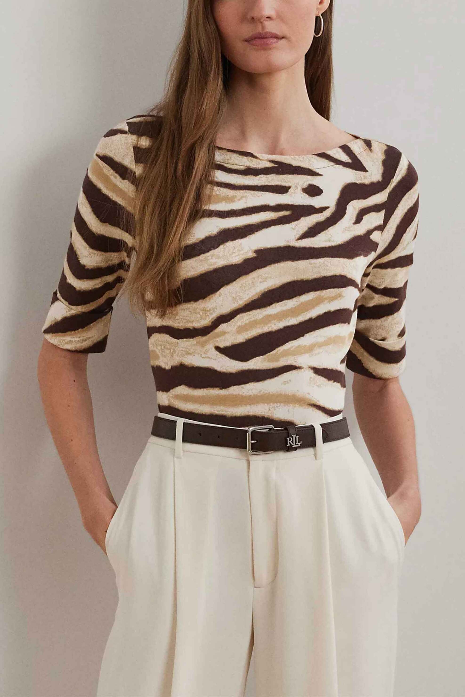 Γυναικεία μπλούζα. Zebra print. Boat λαιμόκοψη. Κοντό μανίκι με ρεβέρ. Slim fit. Προέλευση: Καμπότζη. 94% βαμβάκι, 6% elastane Το μοντέλο έχει ύψος 178 cm και φοράει μέγεθος S. Sustainable: προϊόν που έχει κατασκευαστεί με ίνες ή/και διαδικασίες βιώσιμης παραγωγής, μειώνοντας το περιβαλλοντικό αποτ...