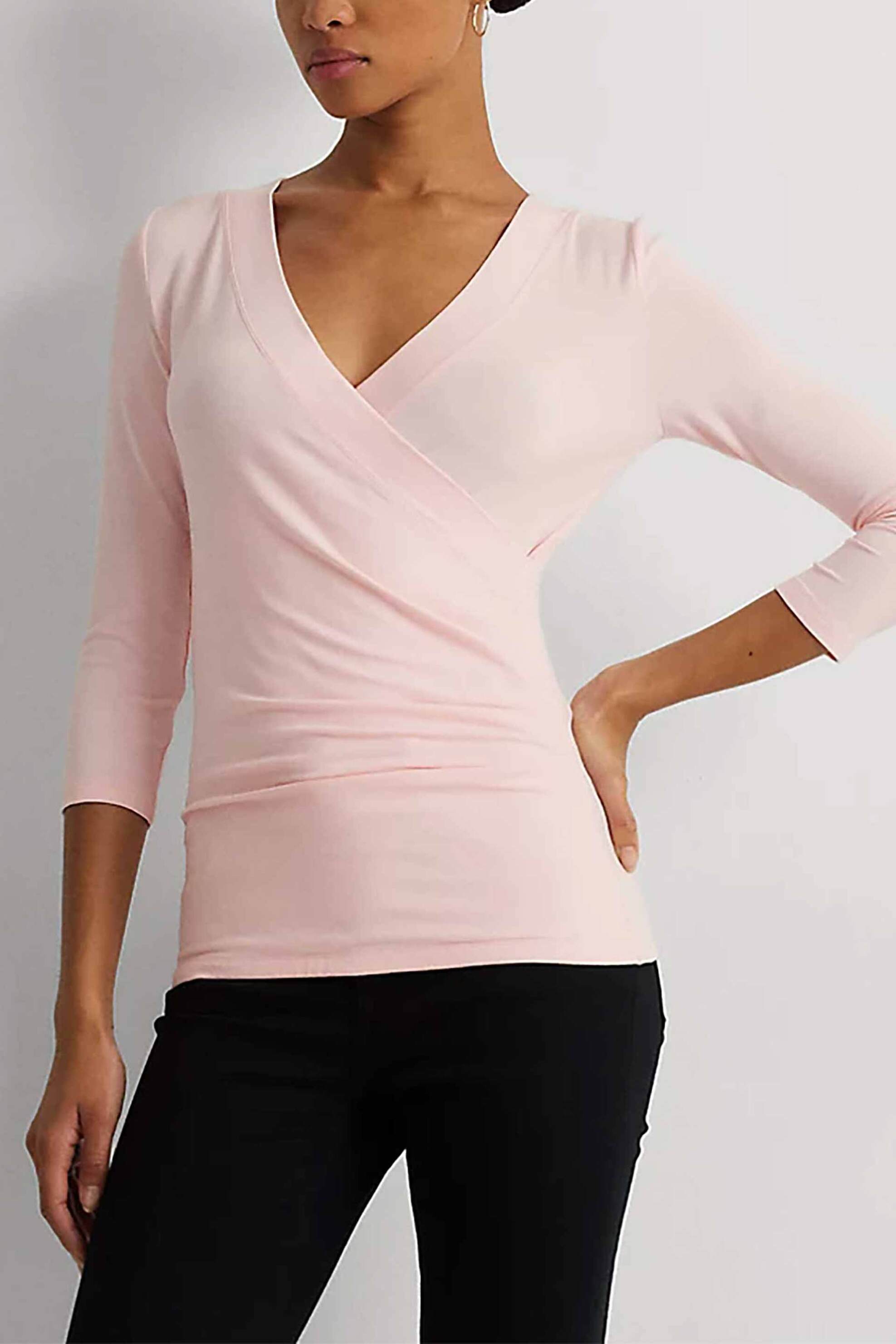 Γυναικεία μπλούζα. Μονόχρωμη. V λαιμόκοψη. Μανίκι 3/4. Κρουαζέ σχέδιο στο μπροστινό μέρος. Λεπτομέρεια με κεντημένο tone-on-tone μονόγραμμα στο μπροστινό μέρος. Slim fit. 95% βισκόζη, 5% elastane Το μοντέλο έχει ύψος 178 cm και φοράει μέγεθος S.