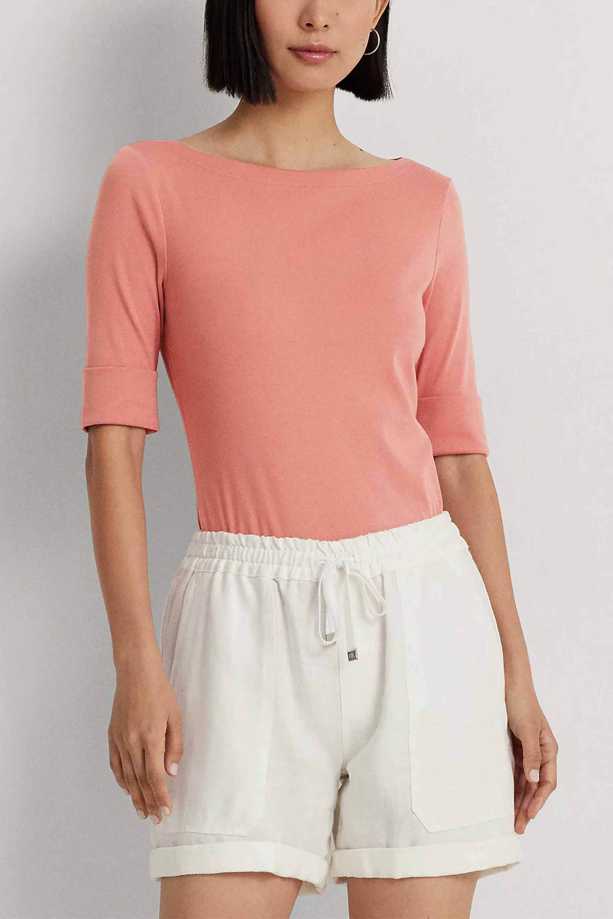 Γυναικεία μπλούζα. Μονόχρωμη. Λαιμόκοψη χαμόγελο. Μανίκι 1/2. Γυριστό τελείωμα στα μανίκια. Λεπτομέρεια με κεντημένο tone-on-tone λογότυπο στο μπροστινό μέρος. Slim fit. 94% βαμβάκι, 6% elastane Το μοντέλο έχει ύψος 178 cm και φοράει μέγεθος S.