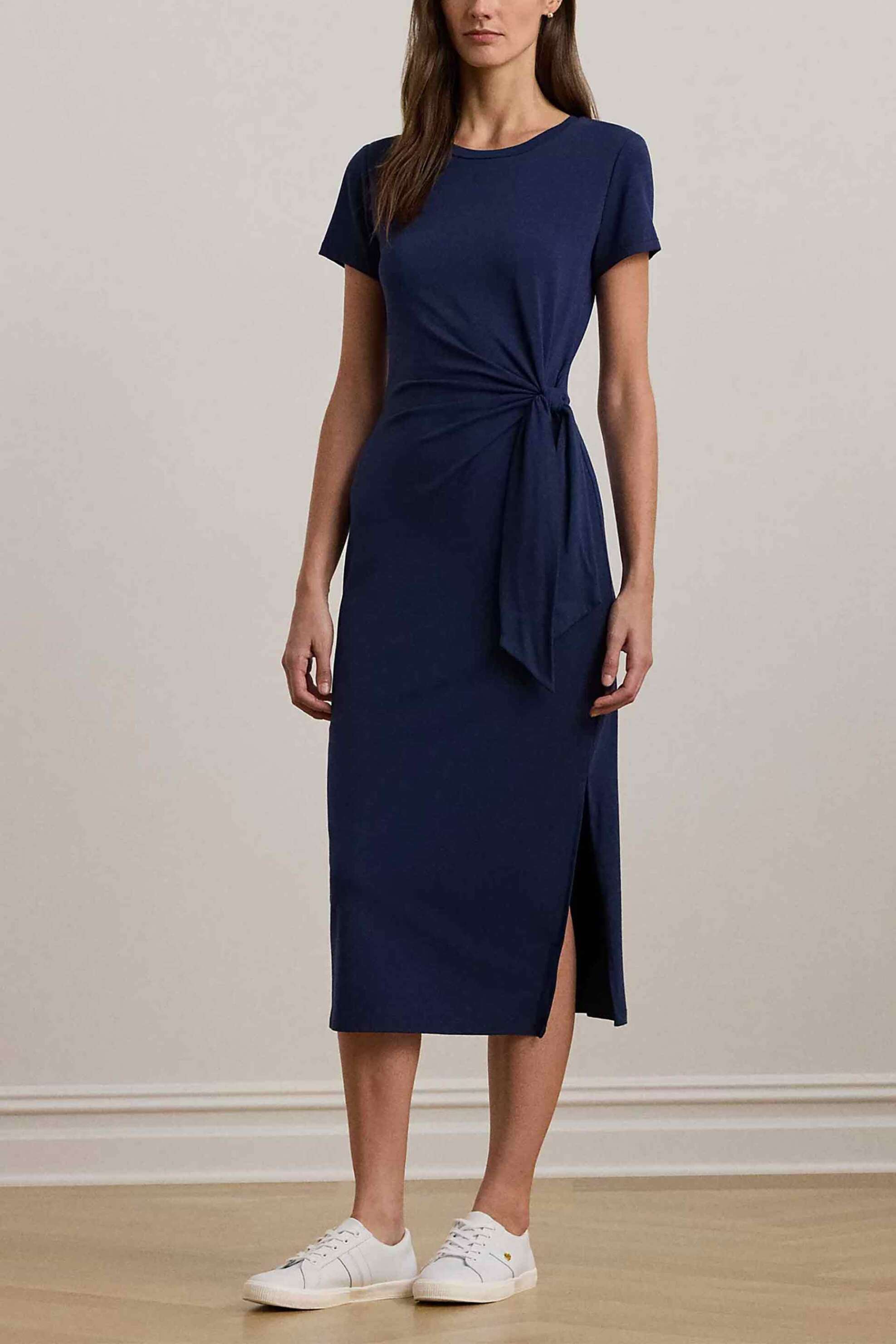 Γυναικείο midi φόρεμα. Μονόχρωμο. Στρογγυλή λαιμόκοψη. Κοντό μανίκι. Σχέδιο με κόμπο στο πλάι. Άνοιγμα στο τελείωμα. Προέλευση: Βιετνάμ. 57% βαμβάκι, 38% modal, 5% elastane Το μοντέλο έχει ύψος 178 cm και φοράει μέγεθος S. Sustainable: προϊόν που έχει κατασκευαστεί με ίνες ή/και διαδικασίες βιώσιμη...