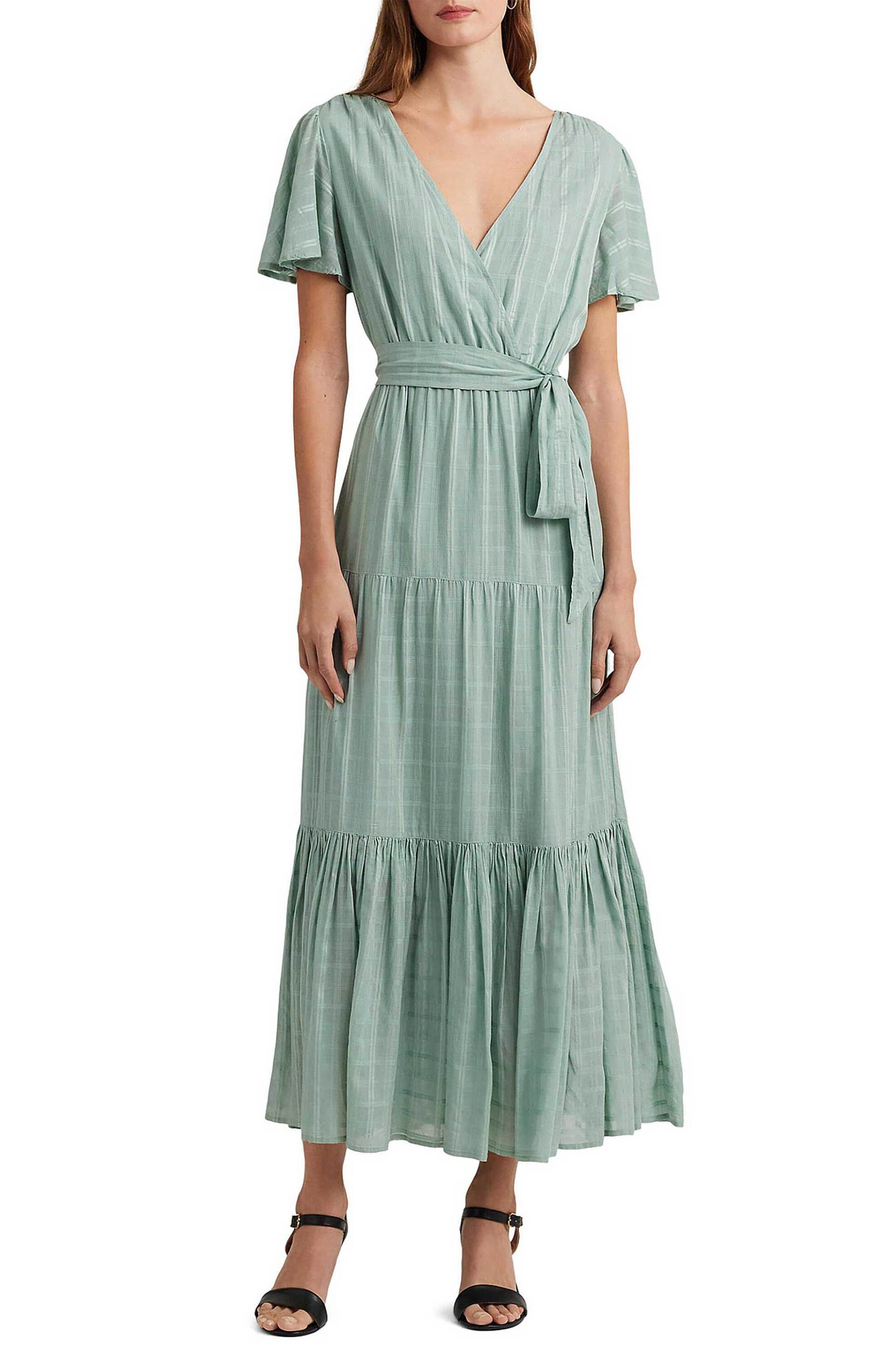 Γυναικείο midi φόρεμα. Μονόχρωμο. V λαιμόκοψη. Κοντό μανίκι. All-over gingham print. Ασορτί ζώνη στην μέση. 30% βαμβάκι, 70% βισκόζη