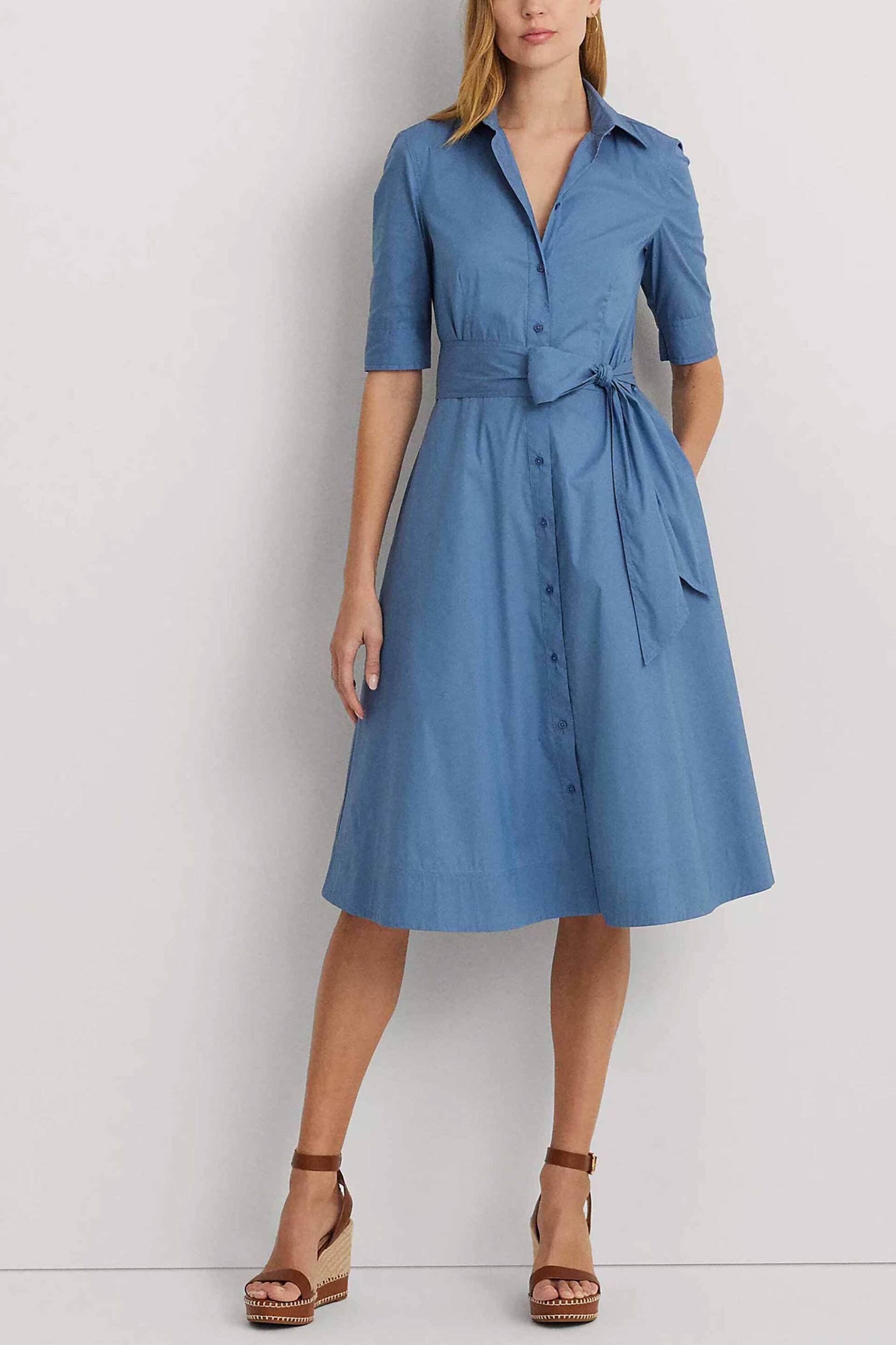 Γυναικείο midi φόρεμα. Μονόχρωμο. Κλασσικός γιακάς. Μανίκι 1/2. Μανσέτες με κουμπιά. Τσέπες στο μπροστινό μέρος. Ασορτί ζώνη στην μέση. Fit and flare. Κλείσιμο με κουμπιά. 65% βαμβάκι, 29% polyamide, 6% elastane Το μοντέλο έχει ύψος 178 cm και φοράει μέγεθος UK 8.