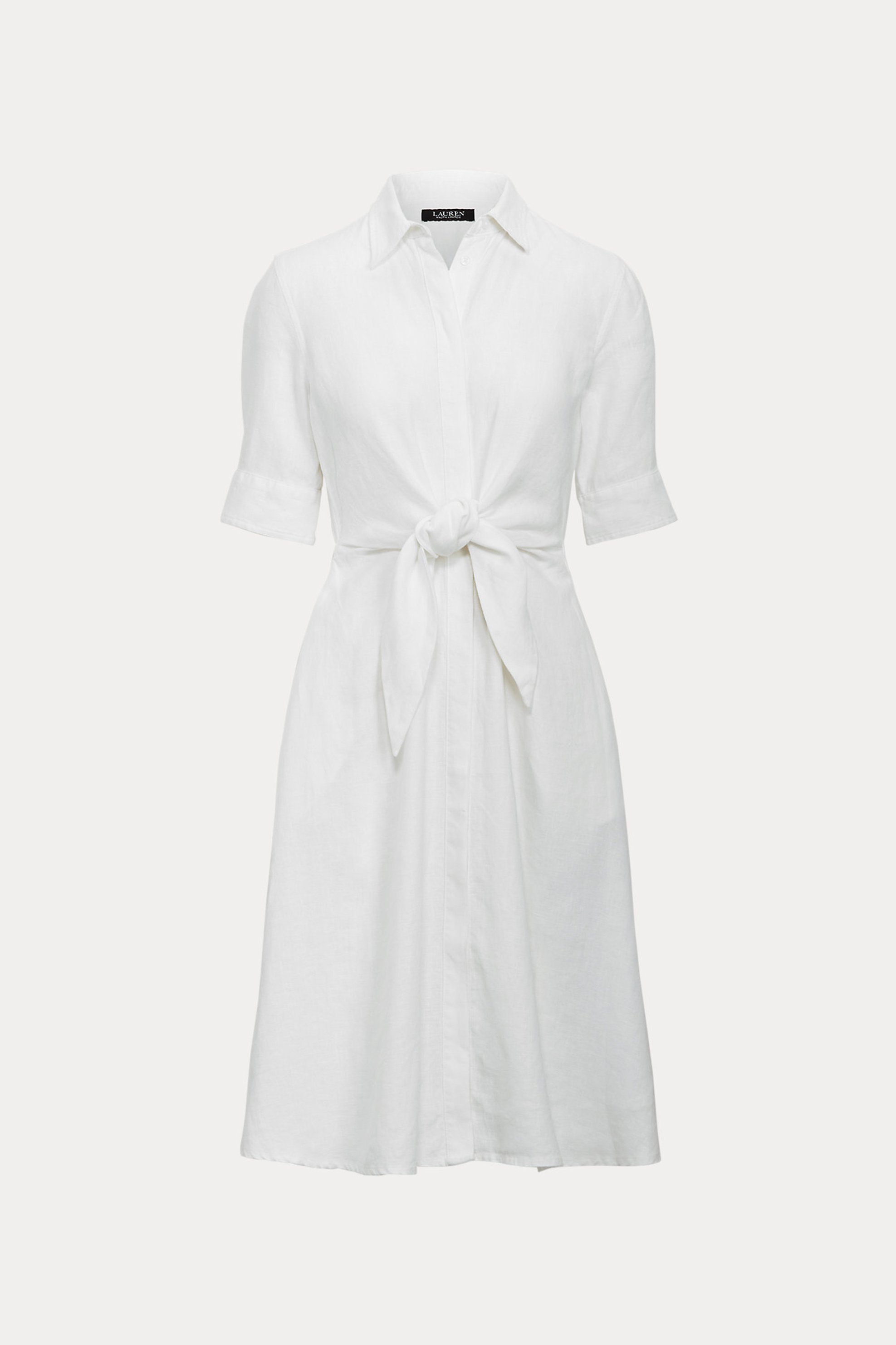 Γυναικείο mini φόρεμα σεμιζιέ. Δένει στη μέση με ενσωματωμένη ζώνη. Κρυφή πατιλέτα με κουμπιά μπροστά. Button up γιακάς. Flared τελείωμα. Kοντό μανίκι. 100% λινάρι