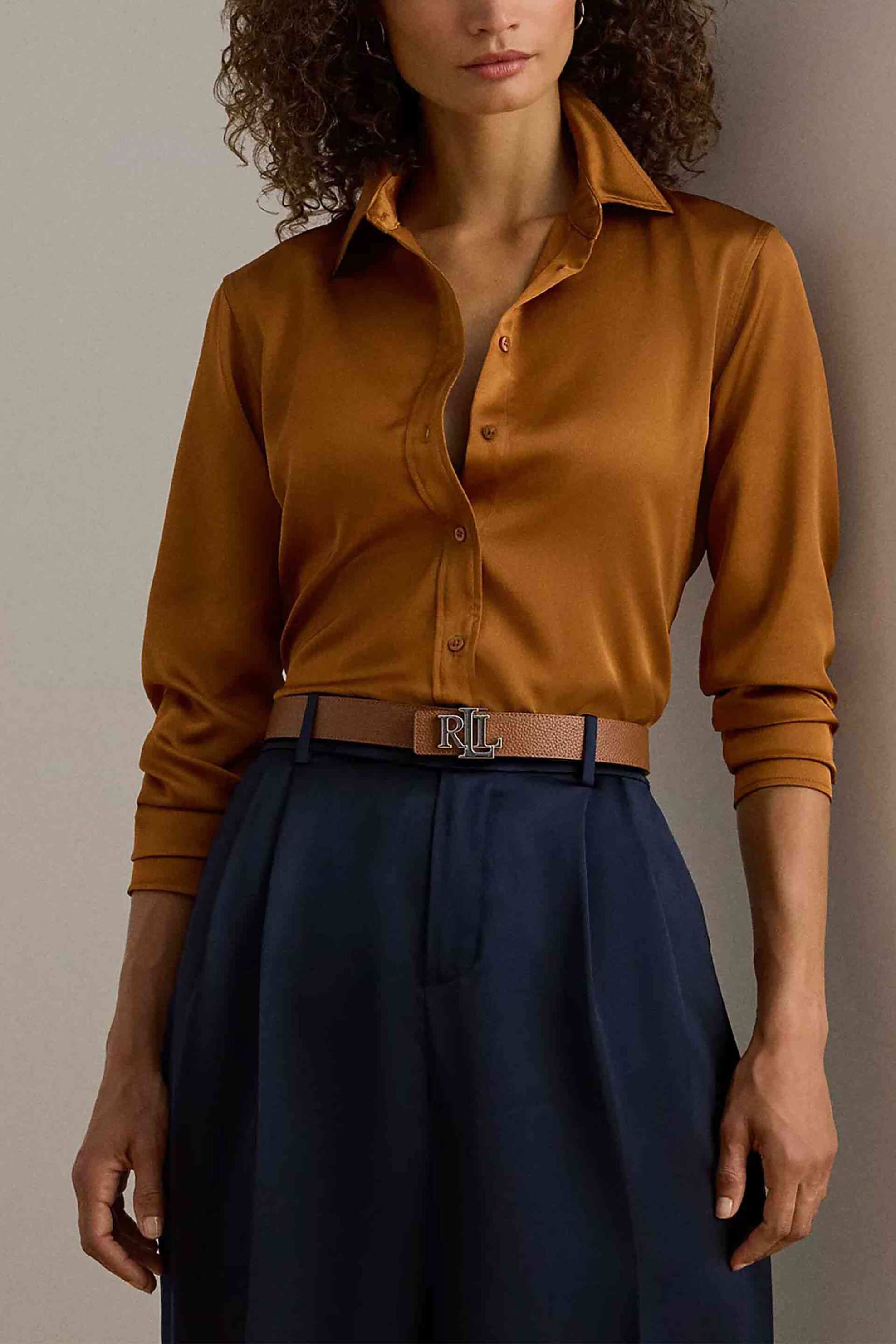 Γυναικείο πουκάμισο. Μονόχρωμο. Σατέν όψη. Κλασικός γιακάς. Κλείσιμο με κουμπιά. Μακρύ μανίκι. Classic fit. Recycled polyester Το μοντέλο έχει ύψος 178 cm και φοράει μέγεθος S. Sustainable: προϊόν που έχει κατασκευαστεί με ίνες ή/και διαδικασίες βιώσιμης παραγωγής, μειώνοντας το περιβαλλοντικό αποτ...