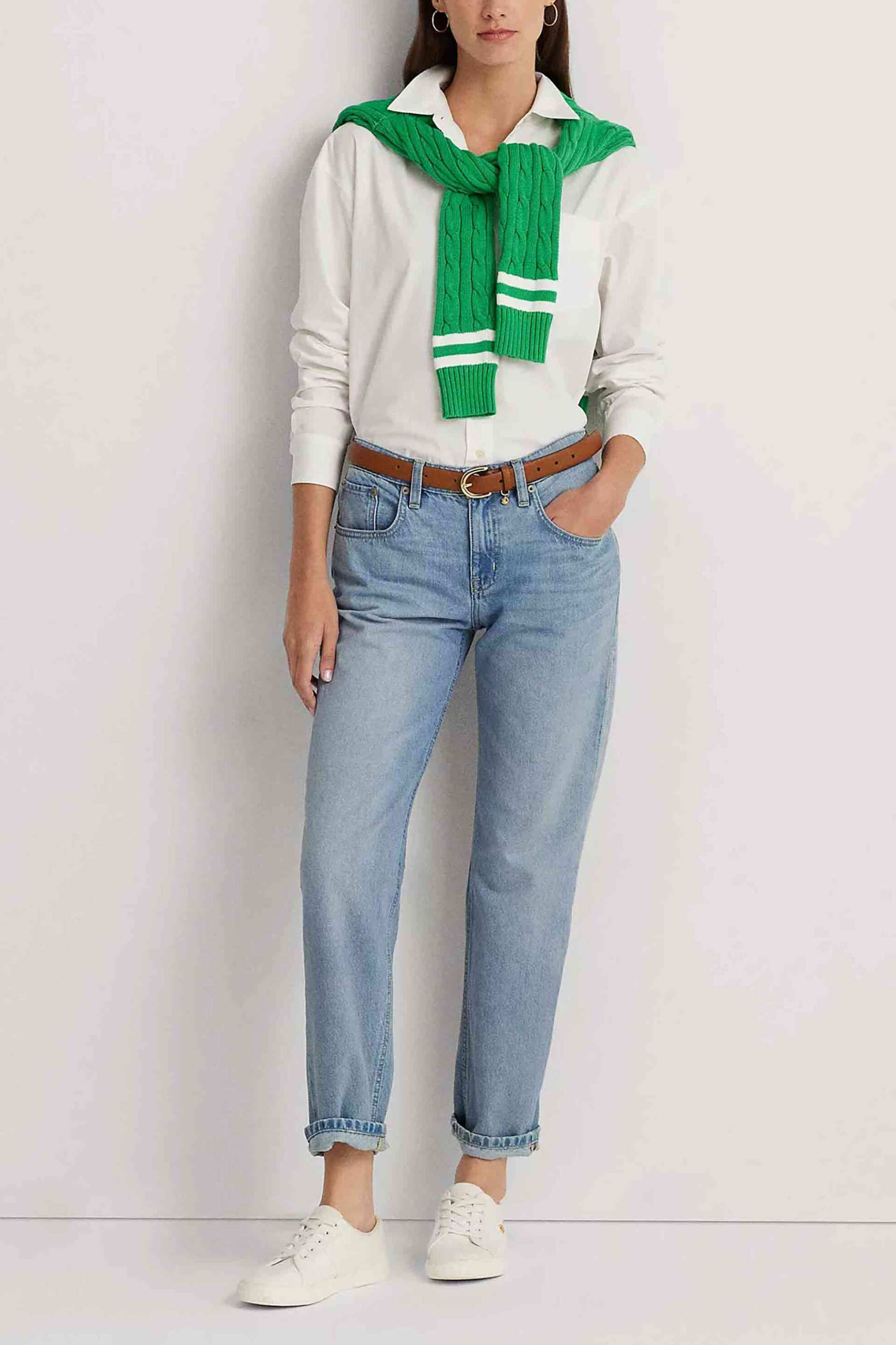 Γυναικείο τζην παντελόνι. Μονόχρωμο. Κλείσιμο με φερμουάρ και κουμπί. Κάθεται στο ύψος της μέσης. Θηλιές για ζώνη. Πεντάτσεπο. Logo patch στο πίσω μέρος. Tapered leg. Relaxed fit. 100% βαμβάκι Το μοντέλο έχει ύψος 178 cm και φοράει μέγεθος 42.