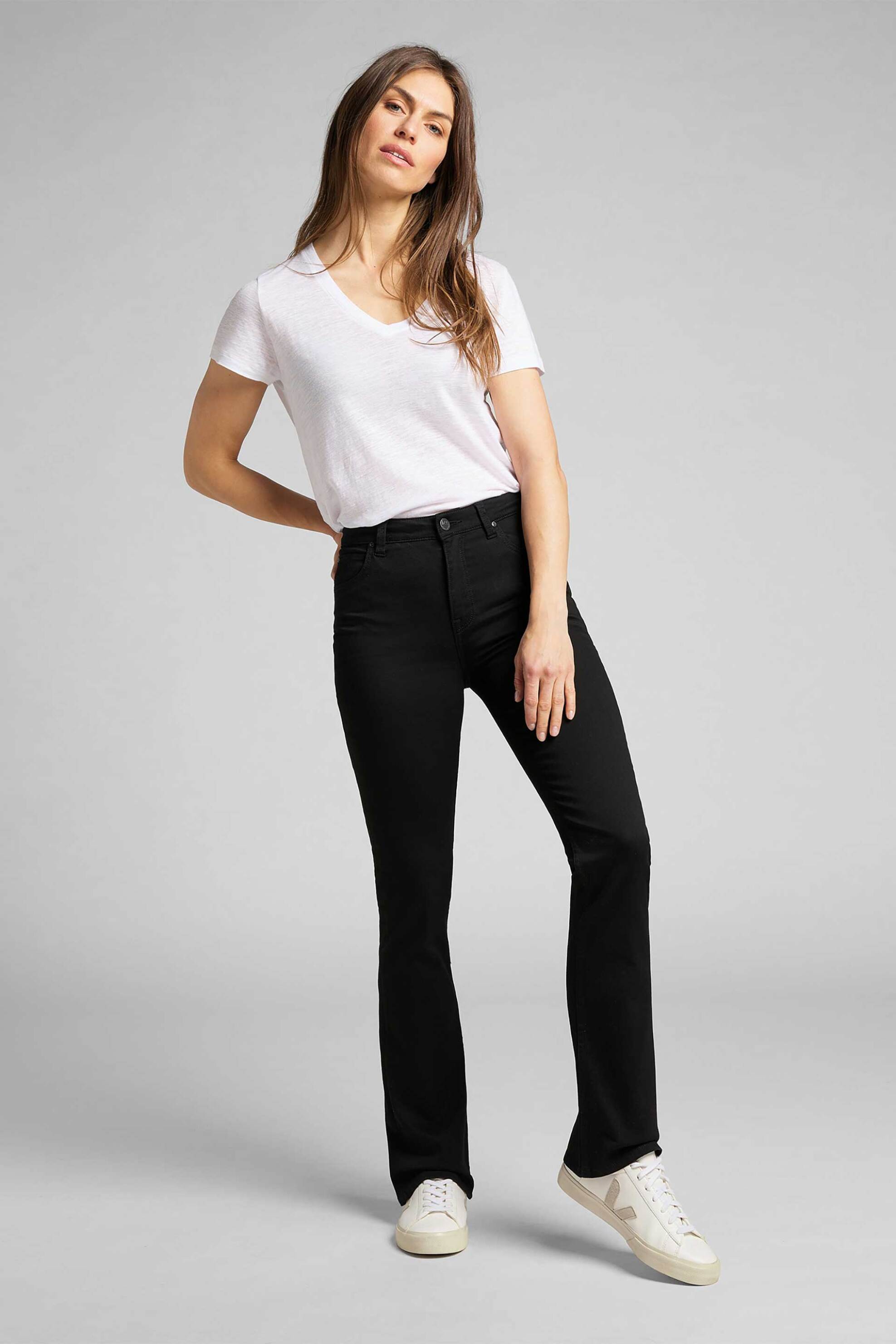 Γυναικείο τζιν παντελόνι. Flare. Πεντάτσεπο. Κλείσιμο με φερμουάρ και κουμπί. Logo lebel. 82% βαμβάκι, 16% polyamide, 2% elastane