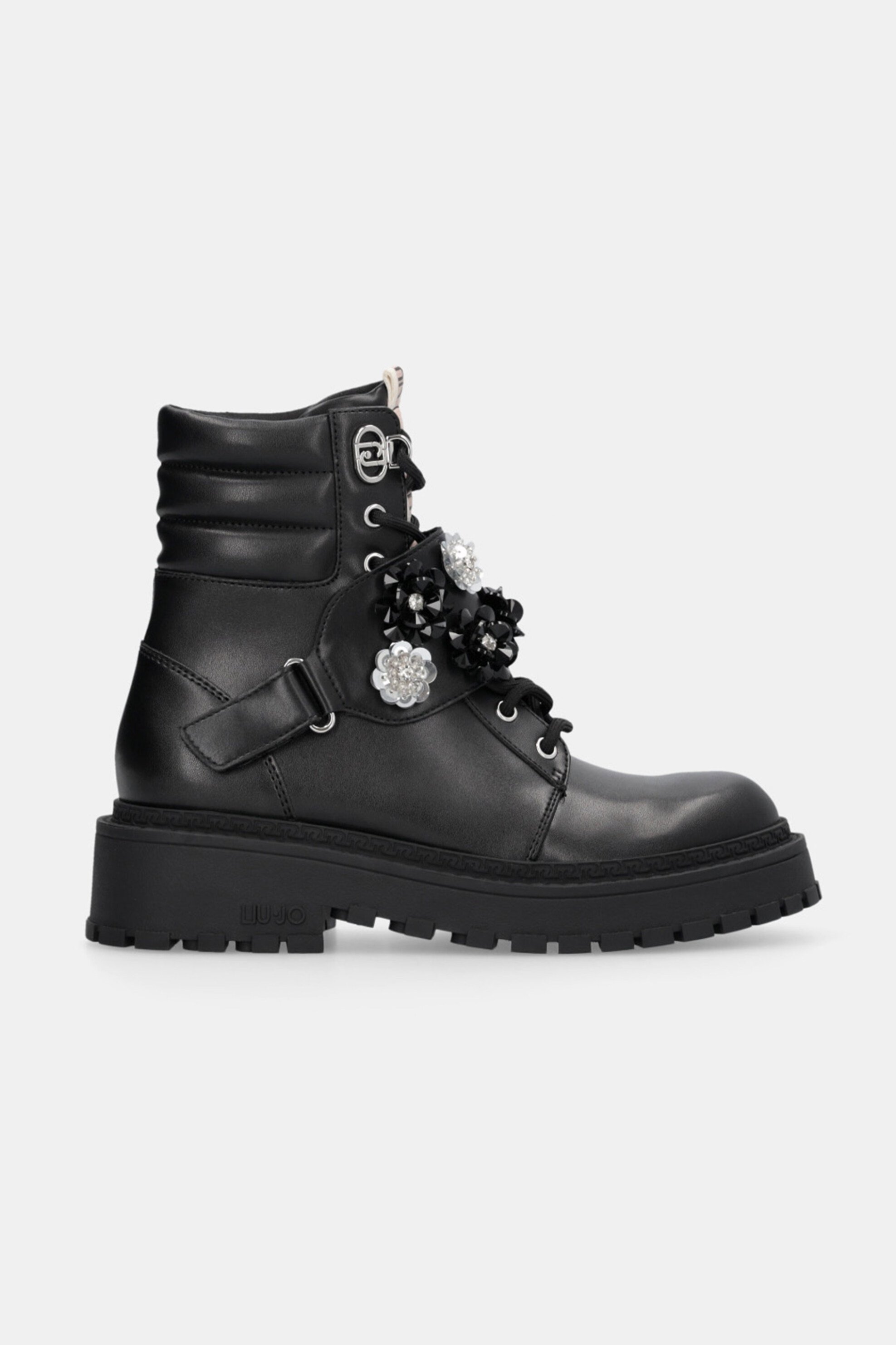 Γυναικεία μποτάκια. Κλείσιμο με κορδόνια. Φάσα στο μπροστά μέρος με διακοσμητικά λουλούδια. Λεπτομέρεια με το λογότυπο στη γλώσσα. 80% δέρμα, 20% polyurethane SHOP & TRADE AEBE