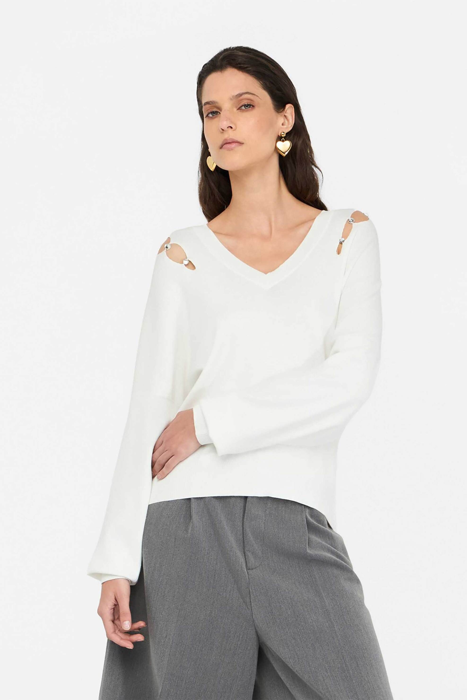 Γυναικεία πλεκτή μπλούζα. V λαιμόκοψη. Διακοσμητικές πέτρες με cut out λεπτομέρεια στους ώμους. Μακρύ μανίκι. Προέλευση: ΚΙΝΑ. 62% βισκόζη, 38% polyester Το μοντέλο έχει ύψος 177 cm και φοράει το νούμερο S. SHOP & TRADE AEBE
