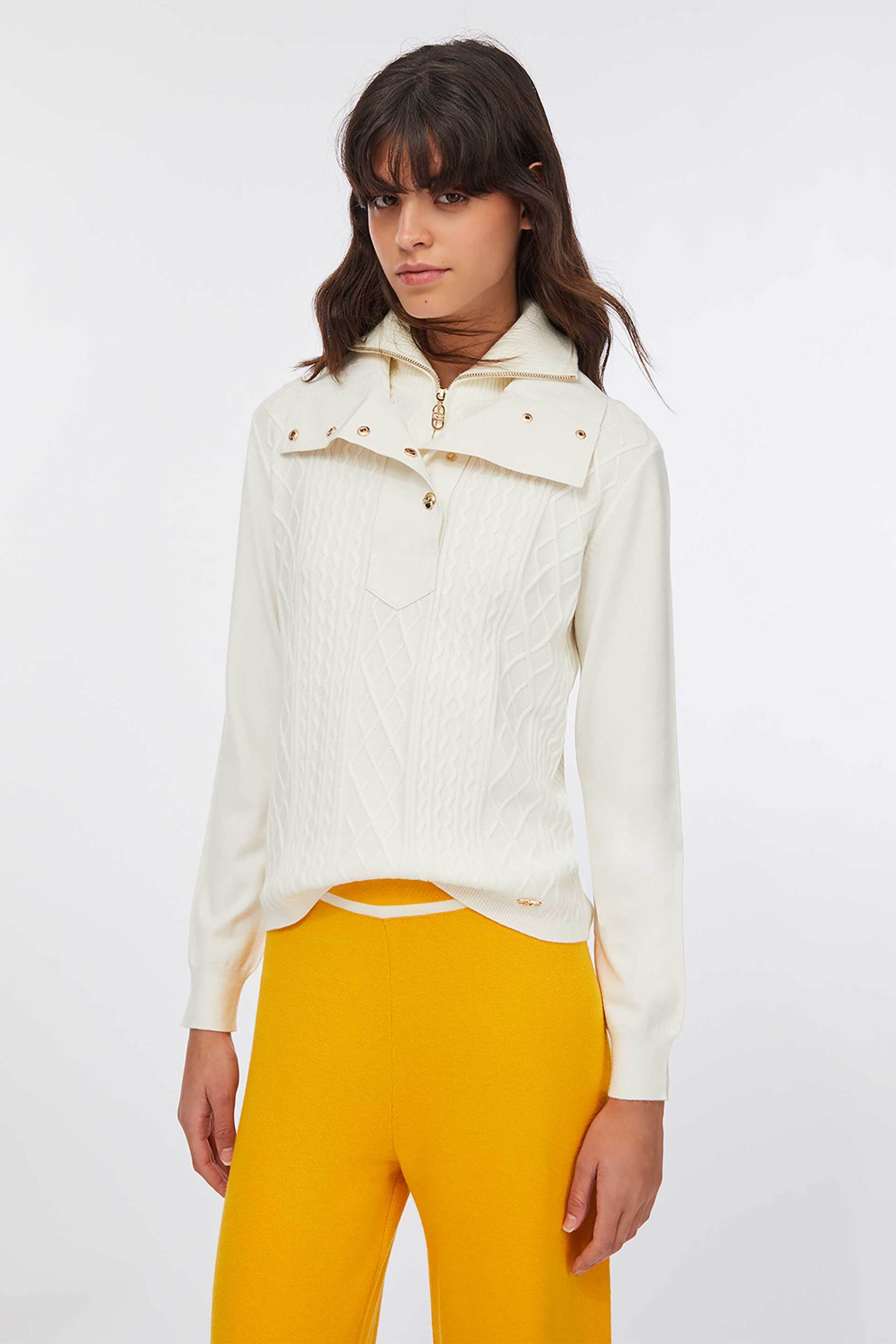 Γυναικεία πλεκτή μπλούζα. Διπλός γιακάς με φερμουάρ και κουμπιά. Ανάγλυφο σχέδιο. Μακρύ μανίκι. Προέλευση: ΚΙΝΑ. 52% nylon, 48% βισκόζη Το μοντέλο έχει ύψος 180 cm και φοράει το νούμερο S. SHOP & TRADE AEBE