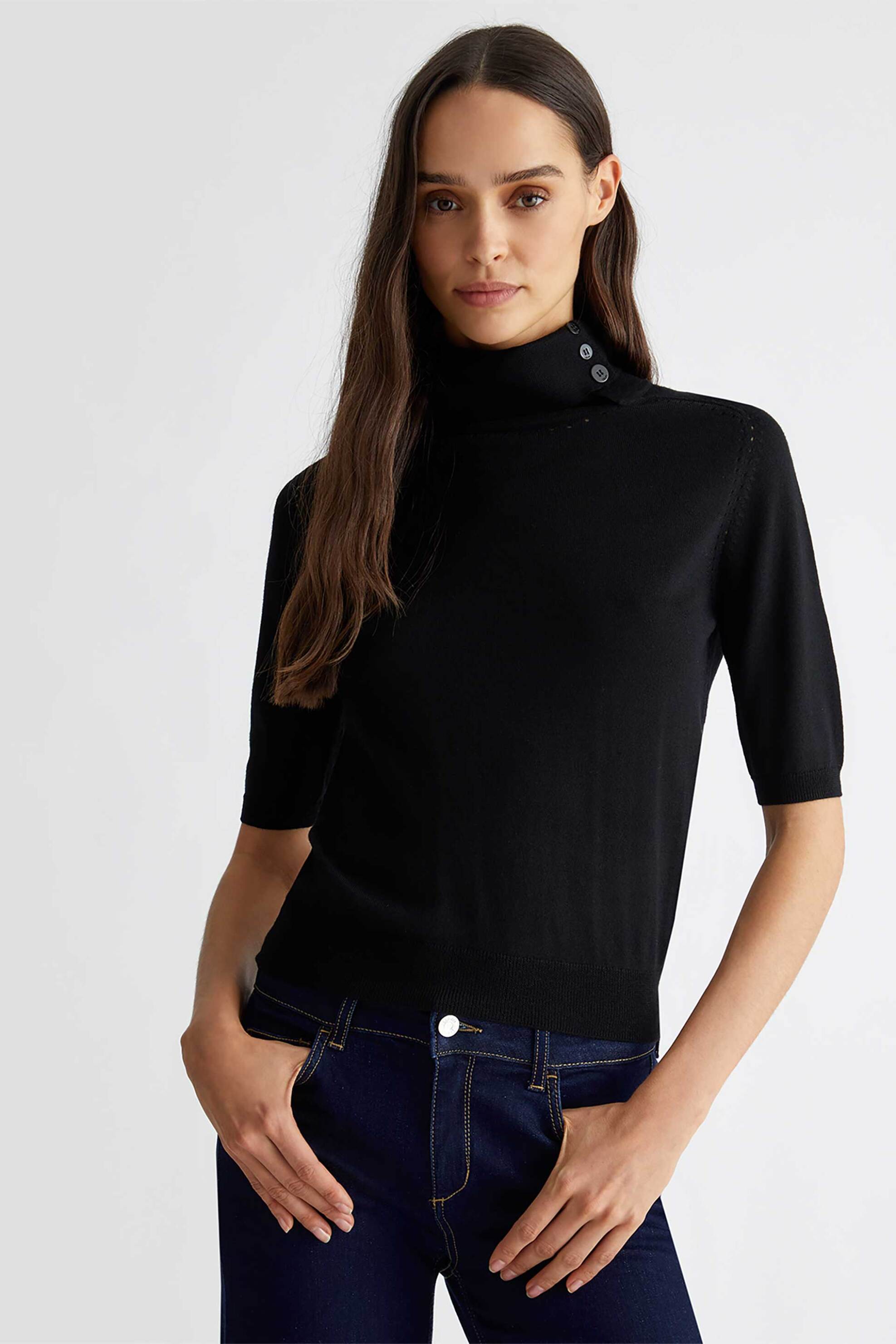 Γυναικεία πλεκτή μπλούζα. Ψηλή λαιμόκοψη με διακοσμητικά κουμπιά. Κοντό μανίκι. 100% fleece μαλλί Το μοντέλο έχει ύψος 178 cm και φοράει νούμερο S.