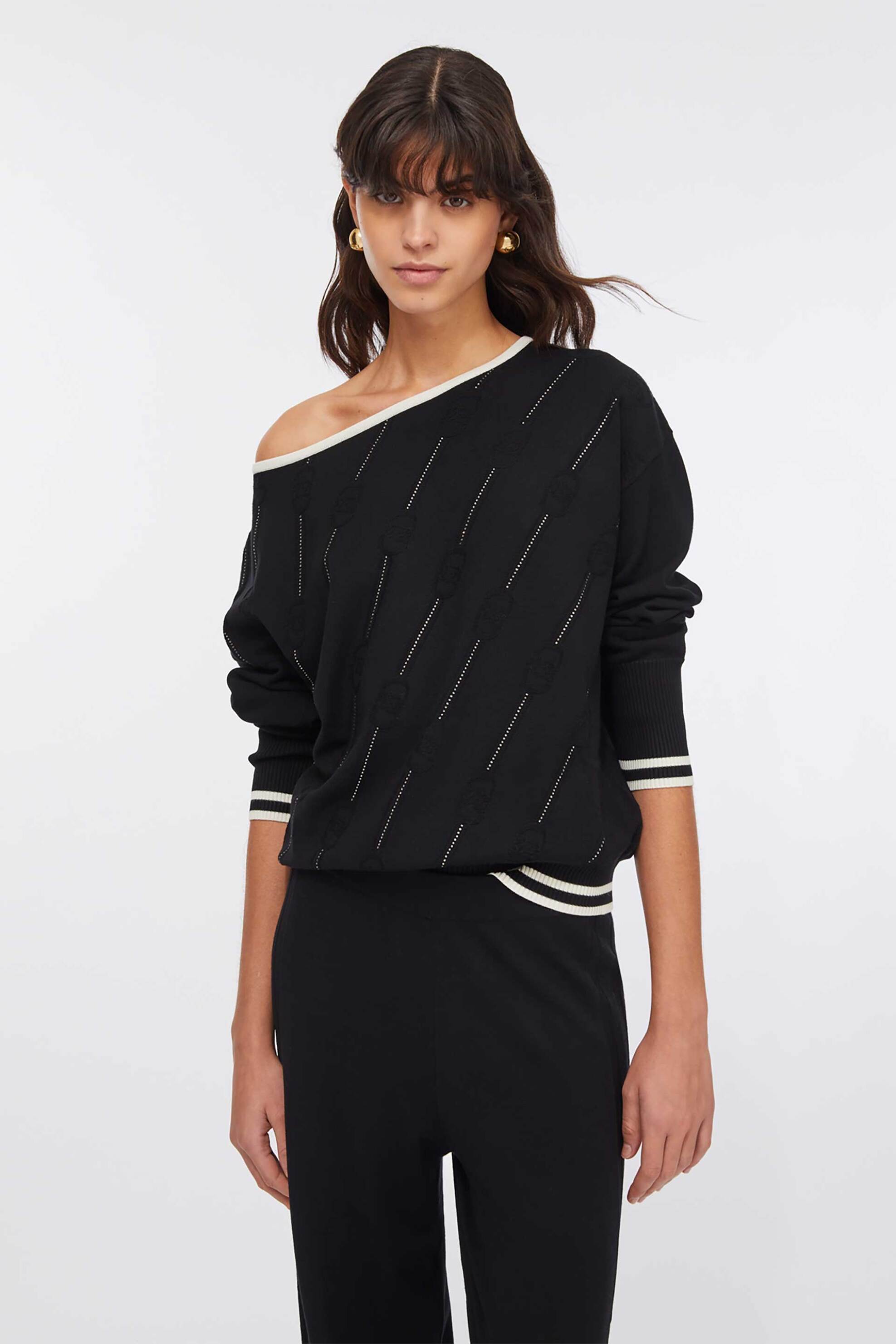 Γυναικεία πλεκτή μπλούζα. Boat λαιμόκοψη. Στρας λεπτομέρεια και λογότυπο μπροστά. Μακρύ μανίκι. Προέλευση: ΚΙΝΑ. 62% βισκόζη, 38% polyester Το μοντέλο έχει ύψος 178 cm και φοράει το νούμερο S. SHOP & TRADE AEBE