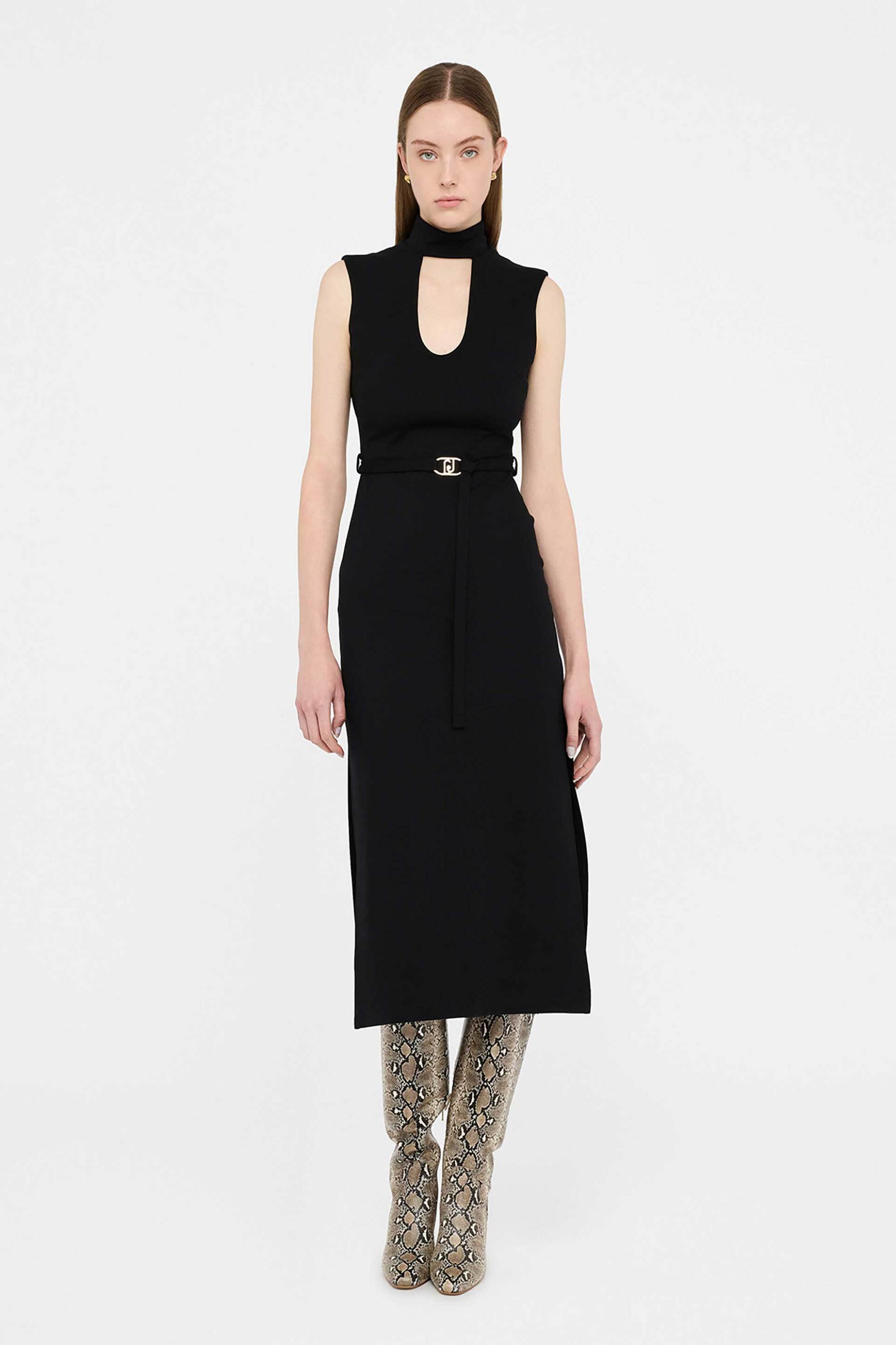 Γυναικείο φόρεμα pencil. Midi. Αμάνικο. Κλειστή λαιμόκοψη. Cut out λεπτομέρεια στην λαιμόκοψη. Ζωνάκι στη μέση με μεταλλικό λογότυπο. Προέλευση: ΑΛΒΑΝΙΑ. 65% βισκόζη, 30% polyamide, 5% elastane Το μοντέλο έχει ύψος 179 cm και φοράει το νούμερο 40. SHOP & TRADE AEBE