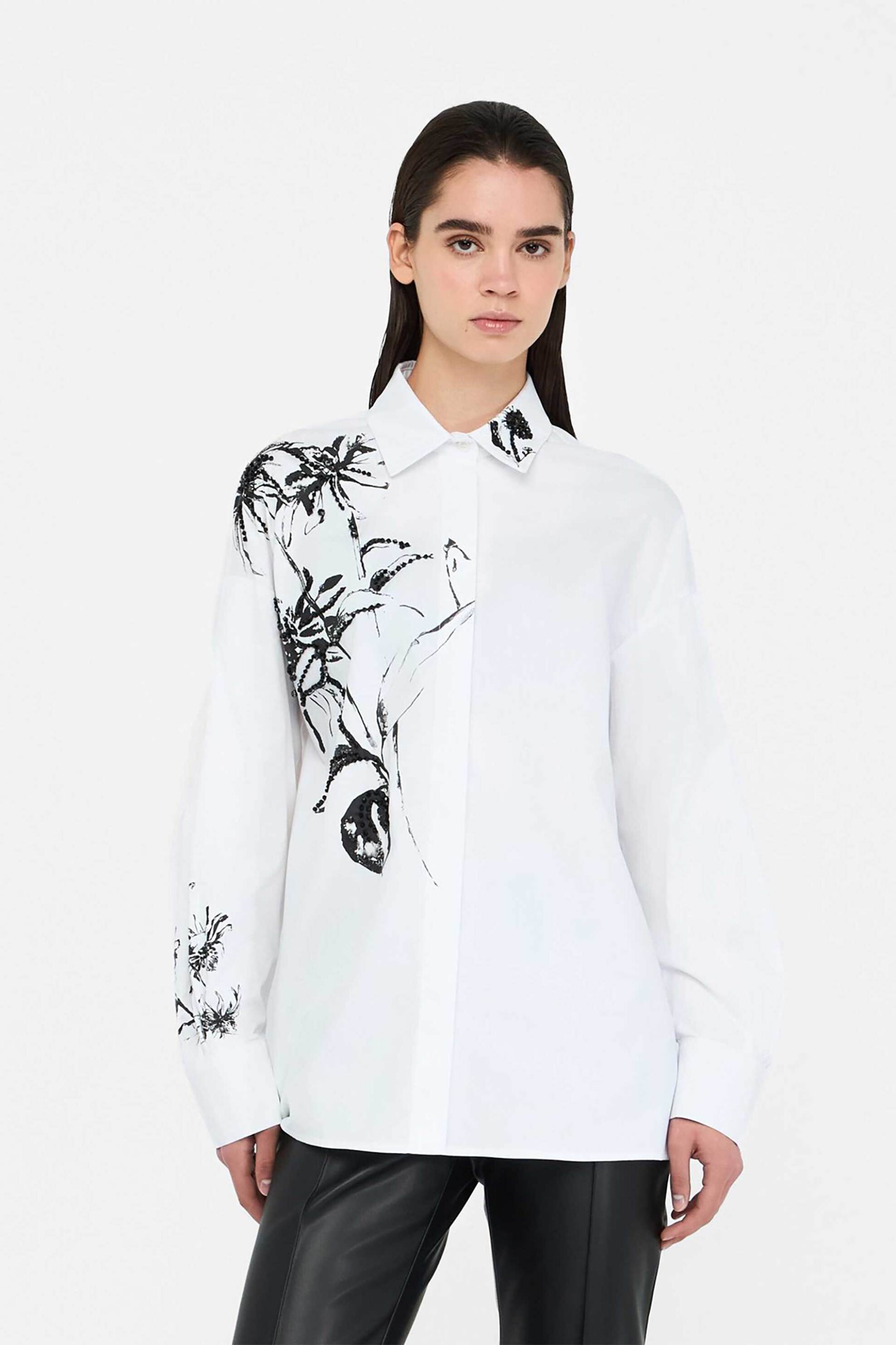 Γυναικείο πουκάμισο. Κλείσιμο με κουμπιά. Μακρύ μανίκι. Σχέδιο με floral print και πέτρες. Oversized. Προέλευση: ΙΤΑΛΙΑ. 100% βαμβάκι Το μοντέλο έχει ύψος 178 cm και φοράει το νούμερο 40. SHOP & TRADE AEBE