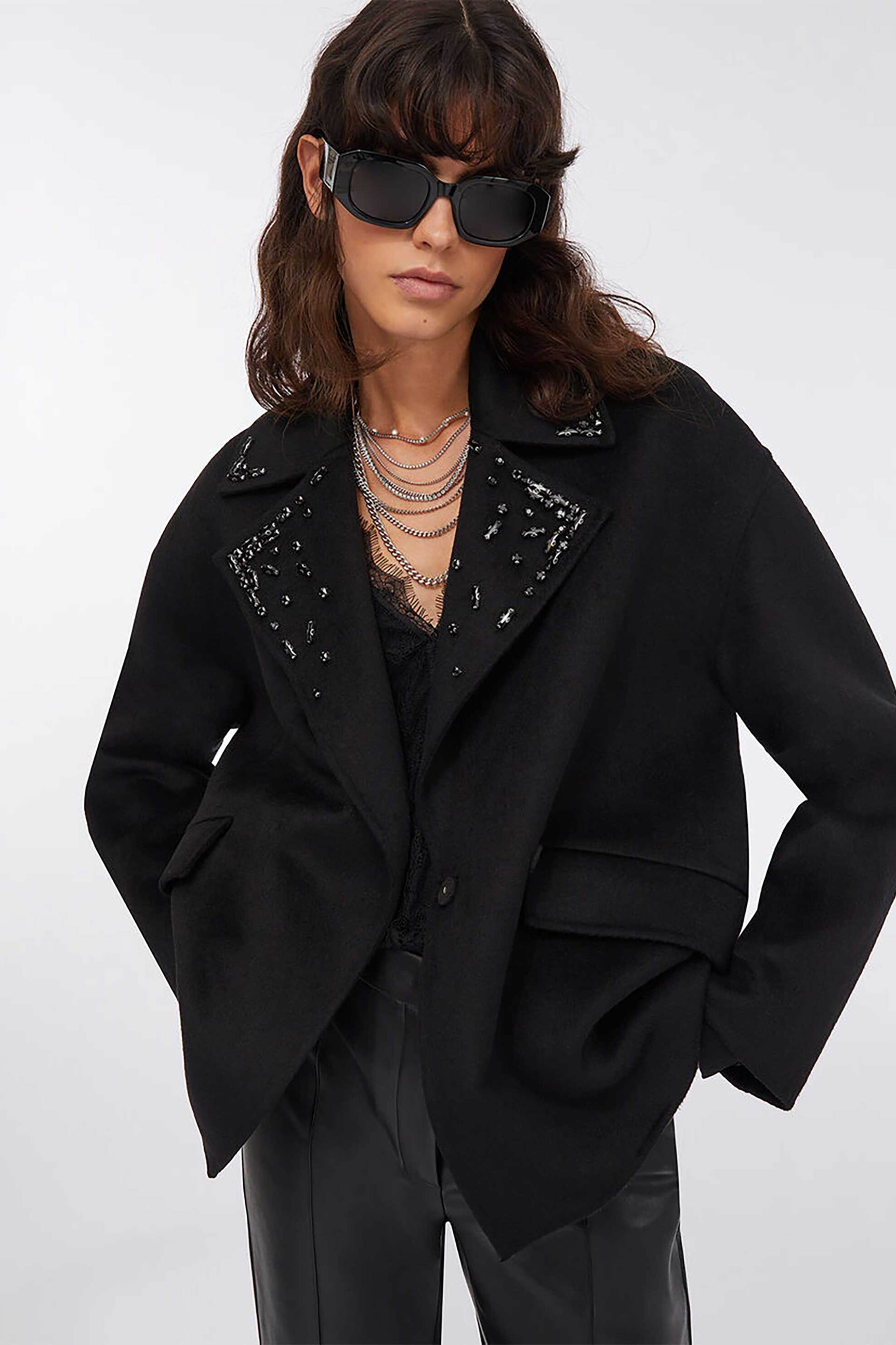 Γυναικείο σακάκι. Γιακάς με κέντημα. Τσέπες flap. Kλείσιμο με κουμπιά. Μακρύ μανίκι. Μεταλλικό λογότυπο στην πλάτη. Προέλευση: Κίνα. 50% polyester, 50% μαλλί Το μοντέλο έχει ύψος 178 cm και φοράει το νούμερο 40. SHOP & TRADE AEBE