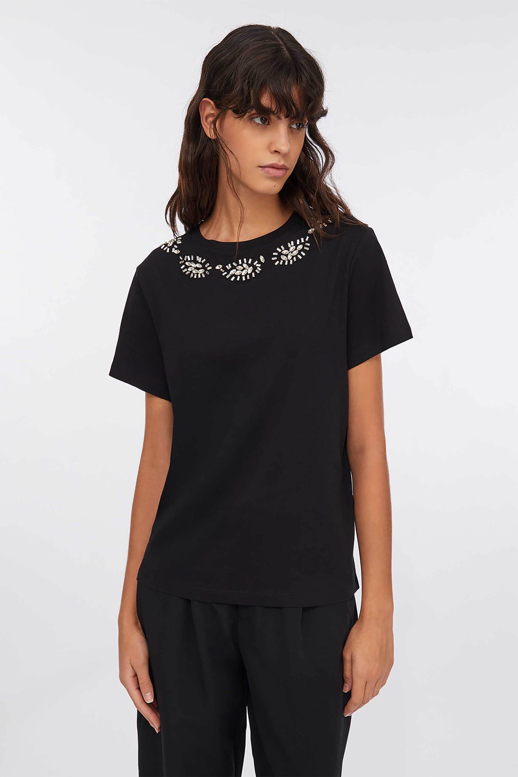 Γυναικείο T-shirt. Μονόχρωμο. Στρογγυλή λαιμόκοψη με στρας. Προέλευση: ΙΤΑΛΙΑ. 100% βαμβάκι Το μοντέλο έχει ύψος 178 cm και φοράει νούμερο S. SHOP & TRADE AEBE
