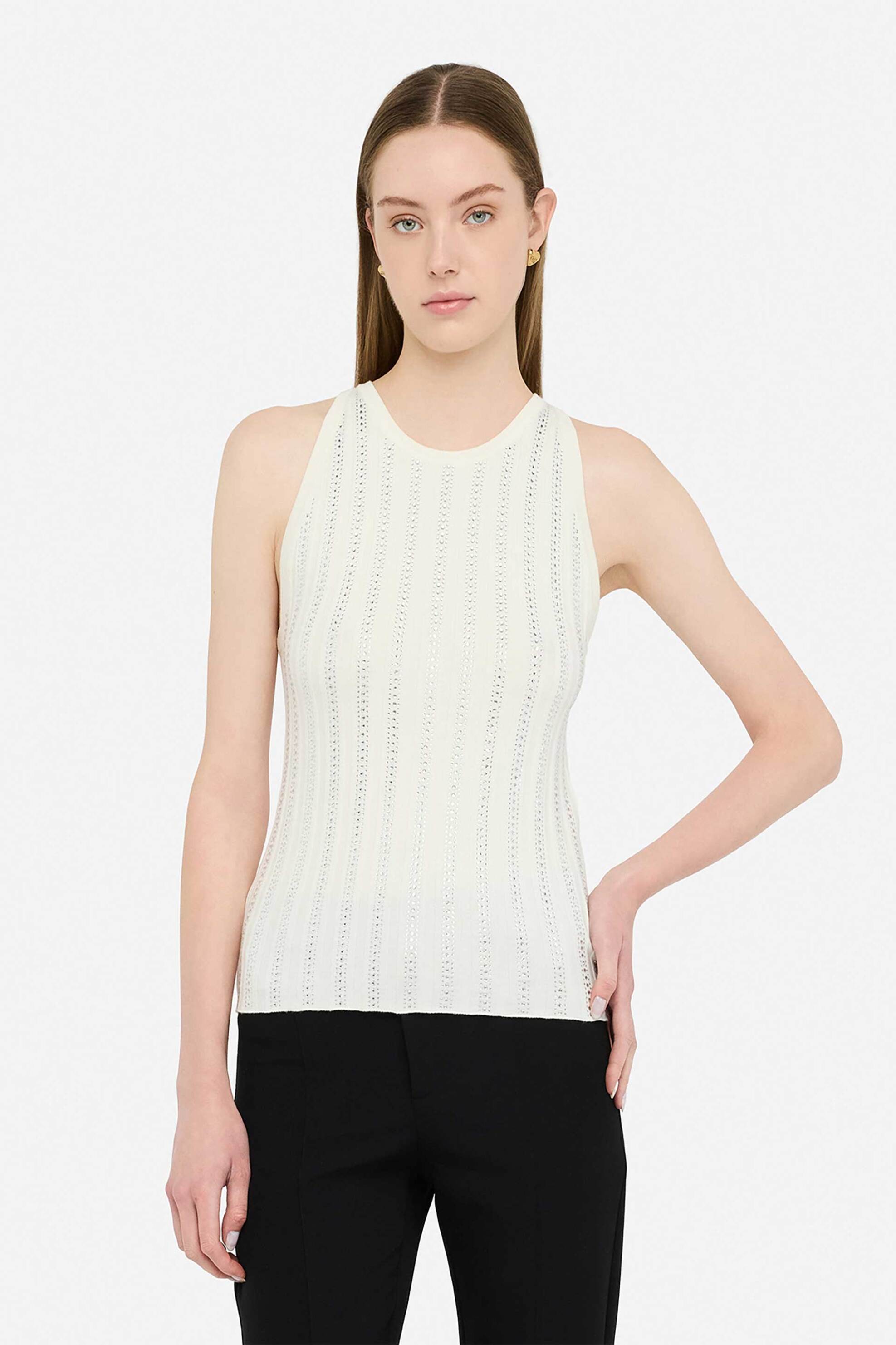 Γυναικείο τοπ. Αμάνικο. Στρογγυλή λαιμόκοψη. Σχέδιο με στρας. Προέλευση: ΚΙΝΑ. 80% βισκόζη, 20% polyamide Το μοντέλο έχει ύψος 179 cm και φοράει το νούμερο S. SHOP & TRADE AEBE