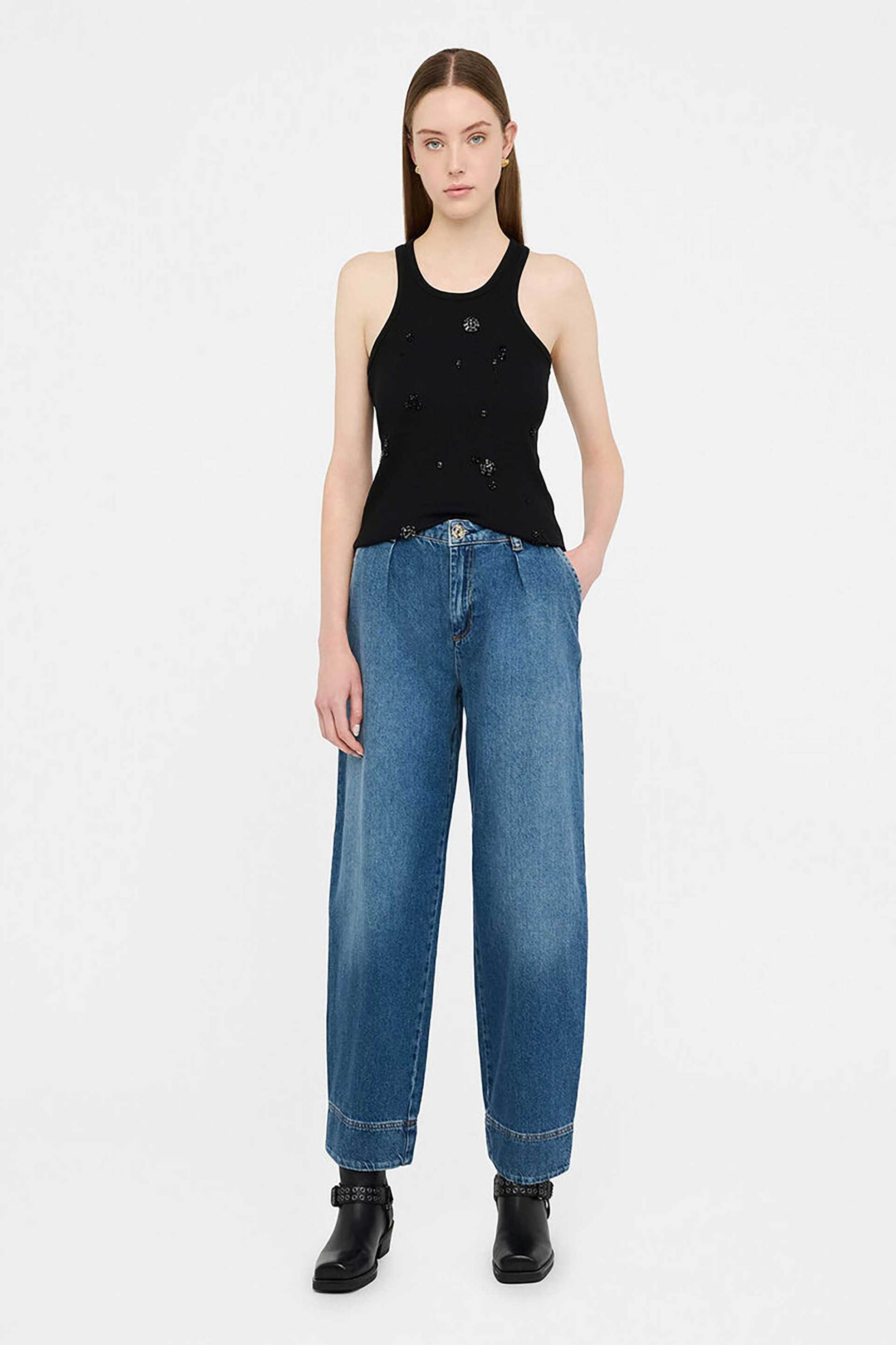 Γυναικείο τζιν παντελόνι. Μονόχρωμο. Κλείσιμο με φερμουάρ και κουμπί. Ψηλόμεσο. Θηλιές για ζώνη. Πεντάτσεπο. Τρούκς στην πίσω τσέπη. Straight leg. Προέλευση: ΤΟΥΡΚΙΑ. 100% βαμβάκι Το μοντέλο έχει ύψος 179 cm και φοράει το νούμερο 27. SHOP & TRADE AEBE