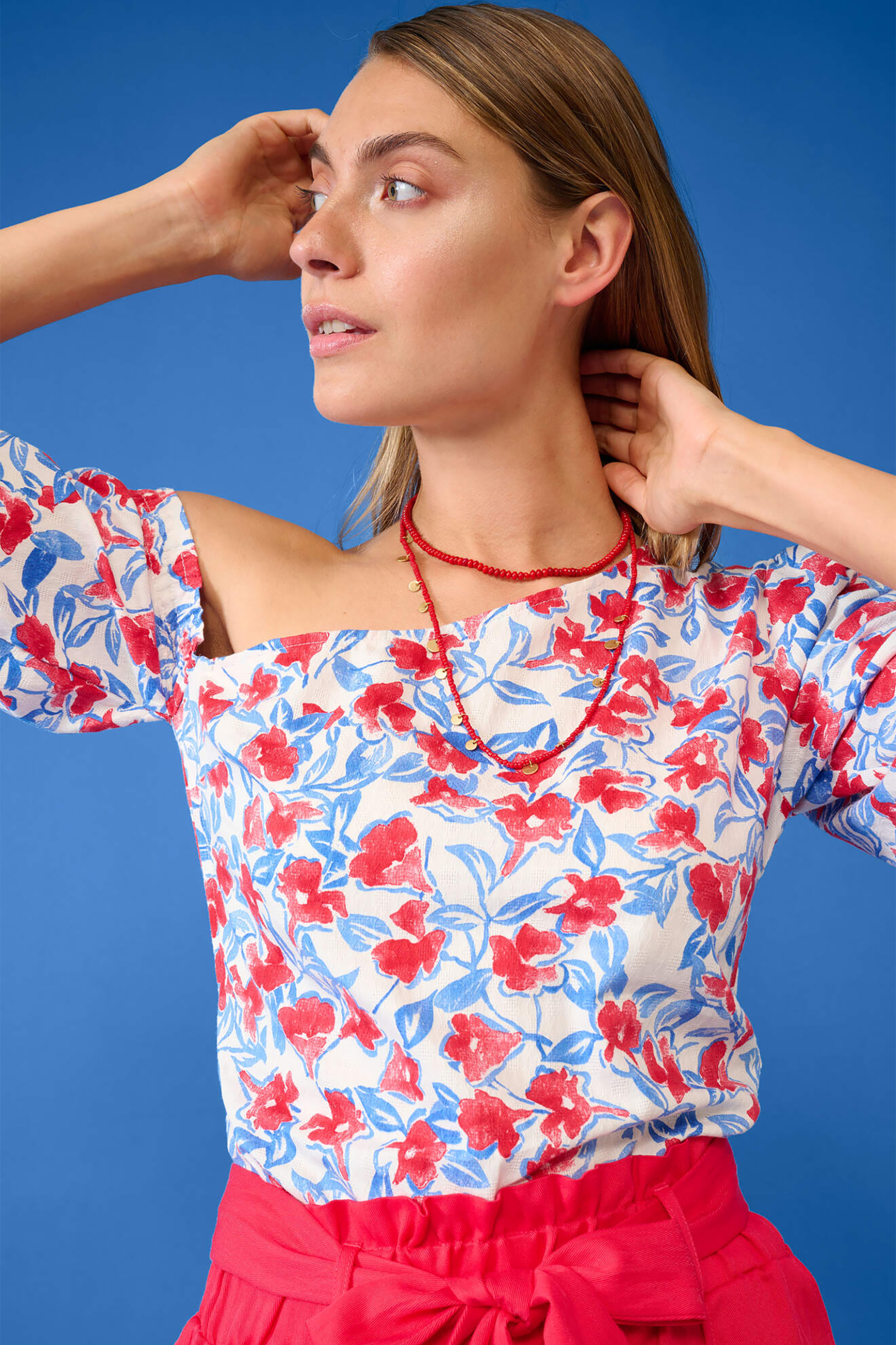 Γυναικεία μπλούζα. All-over floral print. Τετράγωνη λαιμόκοψη με ανοιχτό ώμο. Μανίκι 3/4. Ribbed τελείωμα στα μανίκια. 100% βαμβάκι