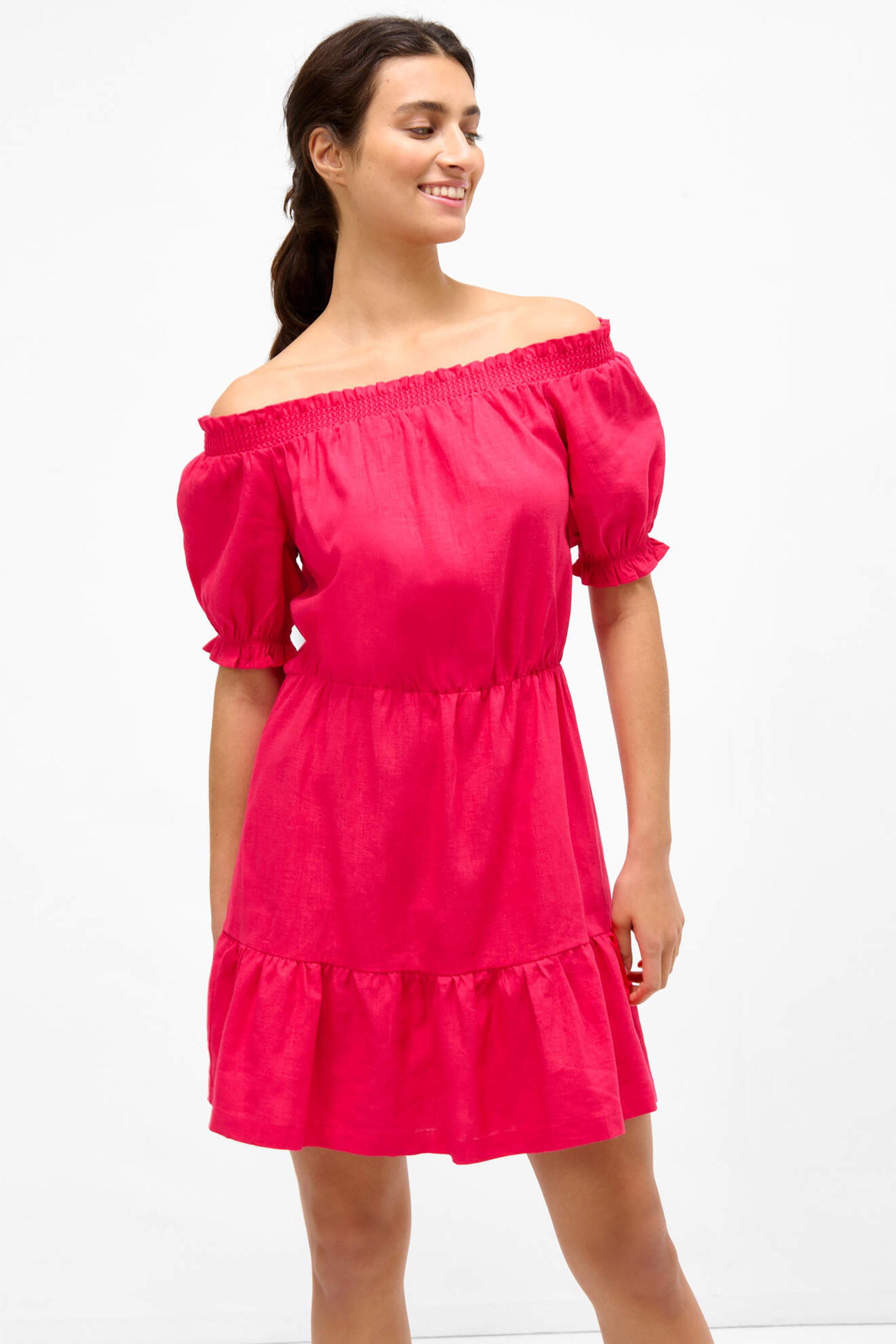 Γυναικείο mini φόρεμα. Μονόχρωμο. Balloon μανίκια κοντά. Carmen λαιμόκοψη. Ribbed στο πάνω μέρος. Διακοσμητικό βολάν στο τελείωμα. 55% λινό, 45% βισκόζη