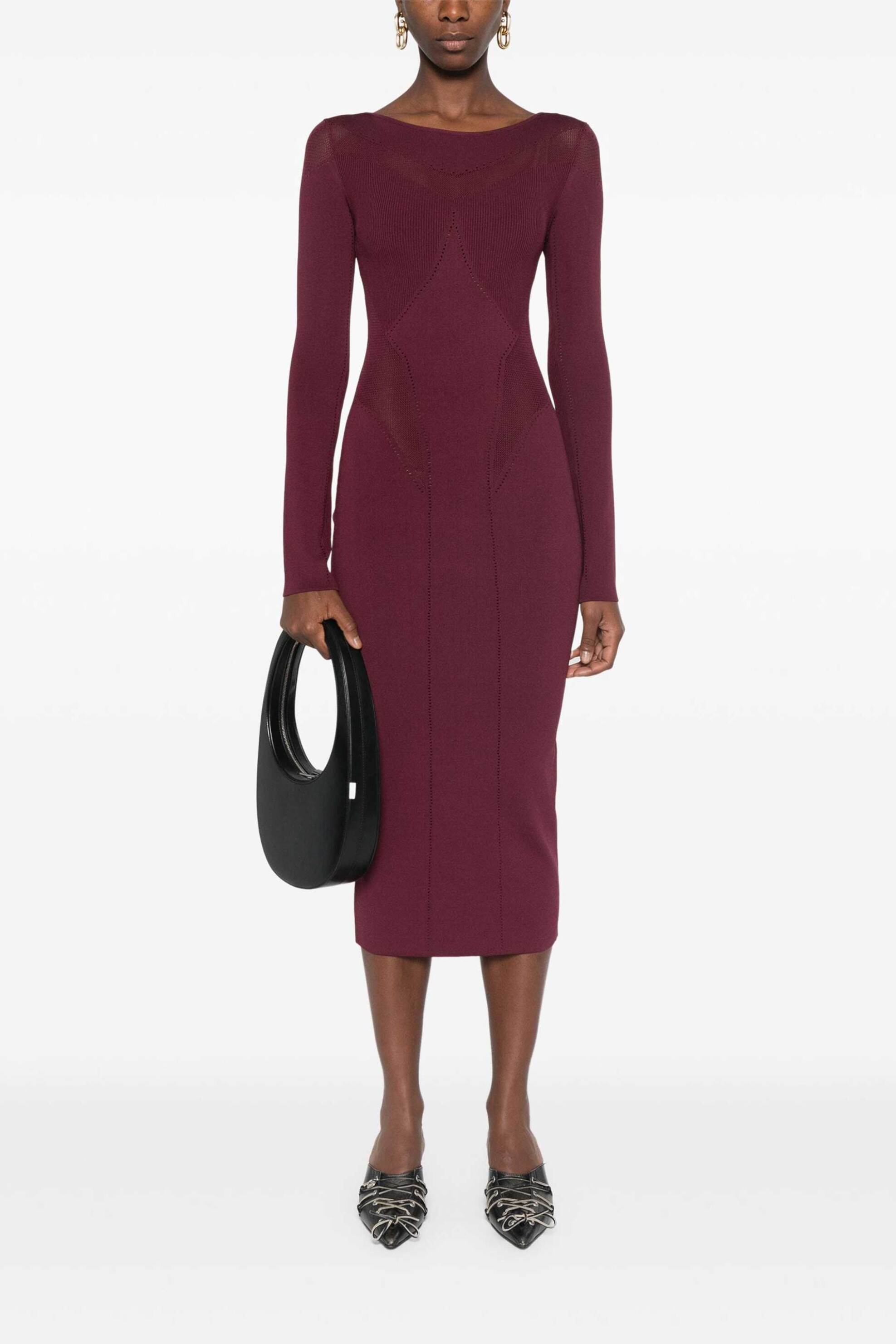 Γυναικείο midi φόρεμα. Μονόχρωμο. Πλεκτό. Στρογγυλή λαιμόκοψη. Μακρύ μανίκι. Λεπτομέρειες στην πλέξη. Μεταλλικό λογότυπο στο πίσω μέρος. 72% βισκόζη, 28% polyamide