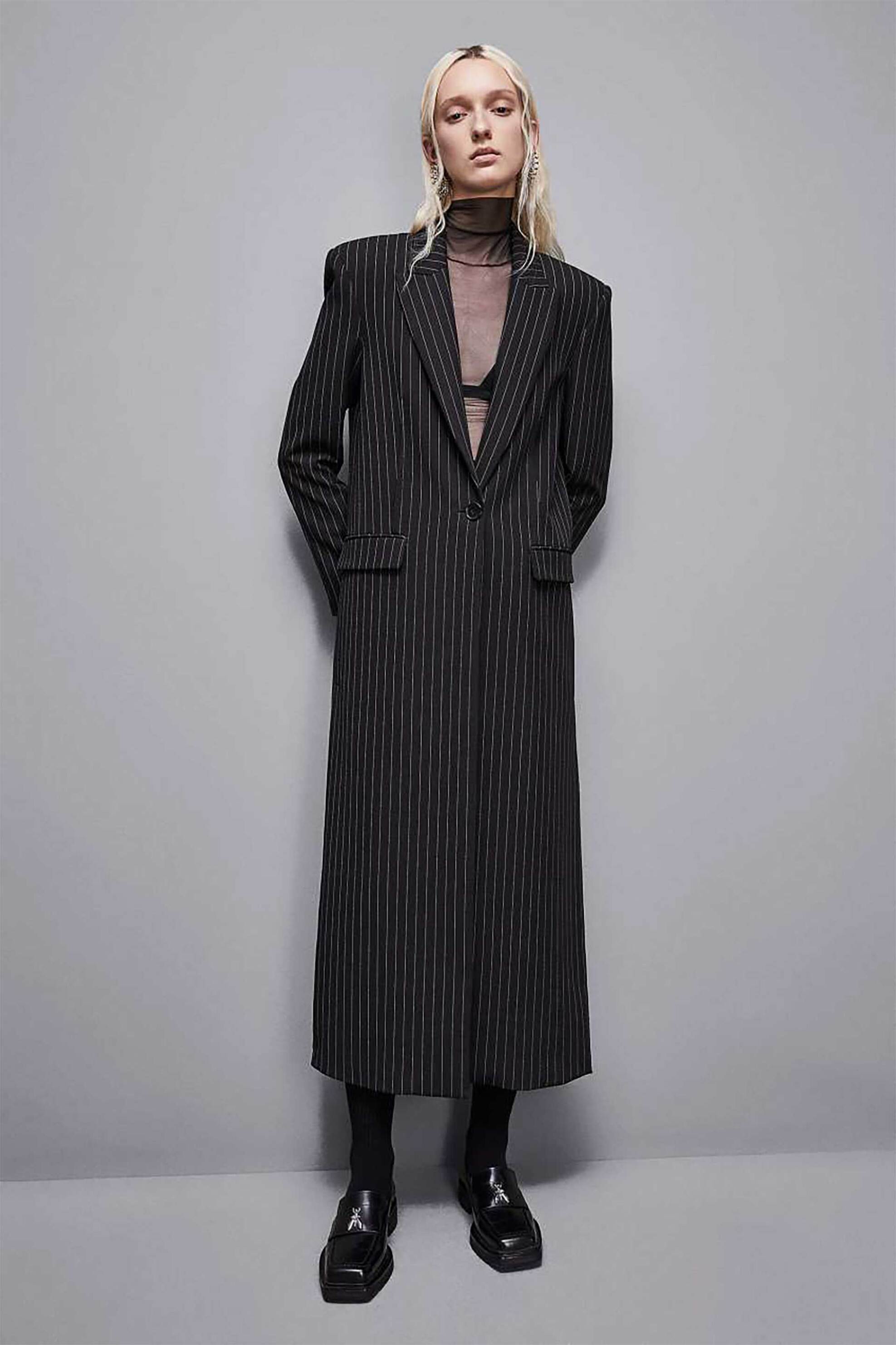 Γυναικείο παλτό. Πέτο γιακάς. Μακρύ μανίκι. Κλείσιμο με κουμπί. Flap τσέπες στο μπροστινό μέρος. Ριγέ σχέδιο. Μεταλλική λεπτομέρεια στο πίσω μέρος. Σκίσιμο στο πλάι. 23% βισκόζη, 72% polyester, 5% elastane