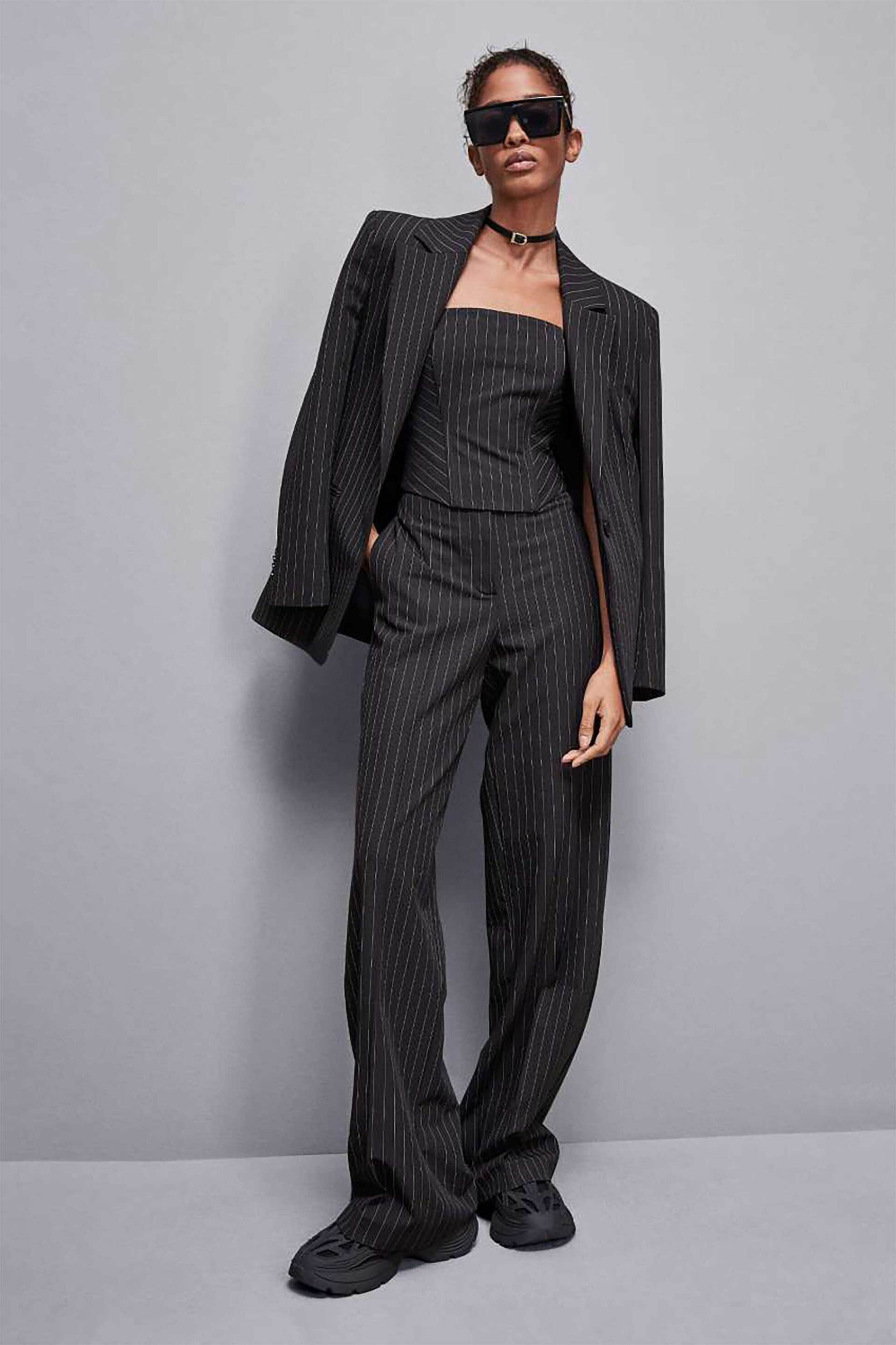 Γυναικείο παντελόνι. Κλείσιμο με φερμουάρ και κουμπί. Τσέπες στο πλάι. Ριγέ σχέδιο. Θηλιές για ζώνη. Boyfriend fit. 23% βισκόζη, 72% polyester, 5% elastane