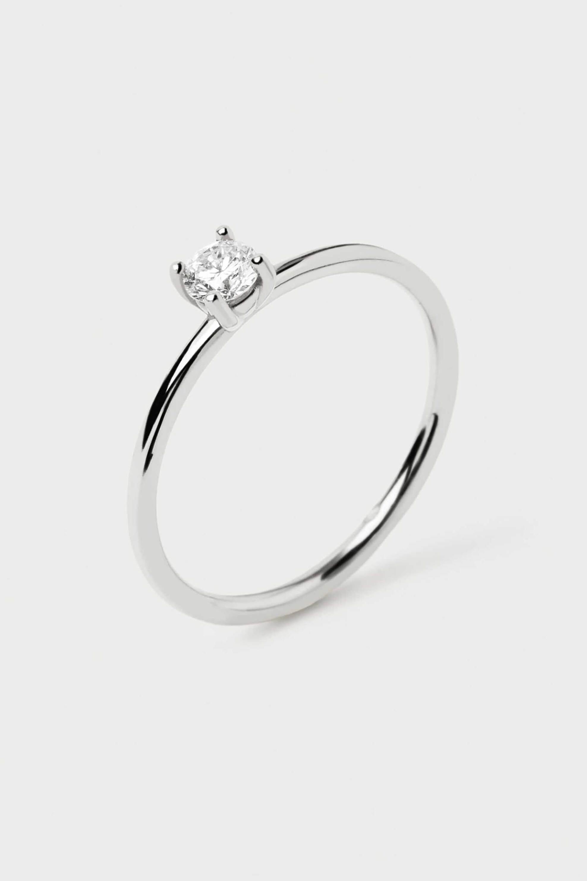 Γυναικείο δαχτυλίδι μονόπετρο. Υλικό: λευκός χρυσός 18 καρατίων. Πέτρες: Διαμάντια που καλλιεργούνται σε εργαστήριο (ποιότητα HSI). Συνολικό βάρος σε καράτια: 0,2. Αριθμός διαμαντιών: 1. Διάμετρος διαμαντιών: 3,8 mm. Πάχος: 1,5 mm. Βάρος: 1,54 gr. Mέγεθος: 12 - 16,5 mm. Προέλευση: TW.