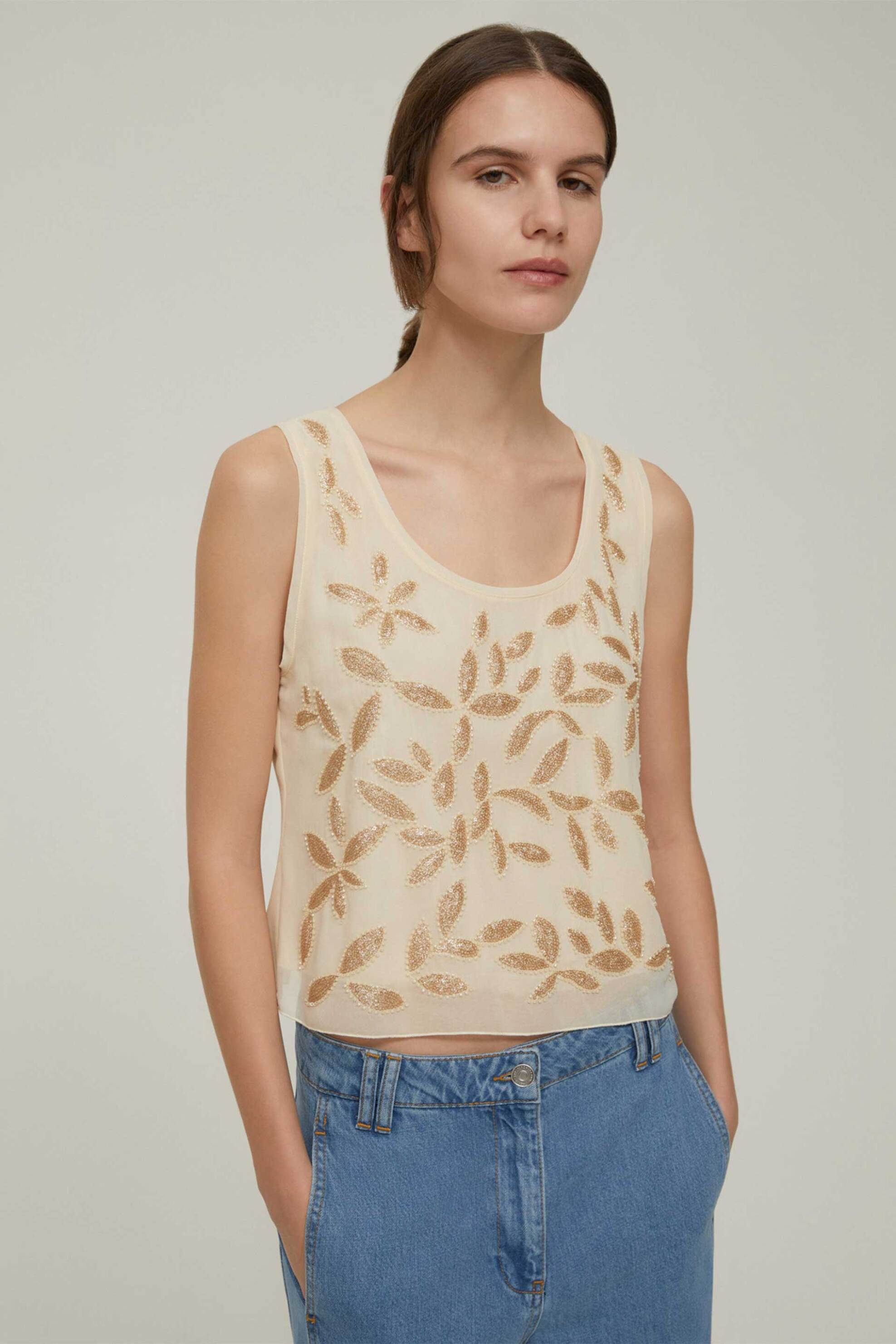 Γυναικείο τοπ. Στρογγυλή λαιμόκοψη. Αμάνικο. Κέντημα με παγιέτα. 100% polyester SPORT & FASHION FREEDOM A.E.