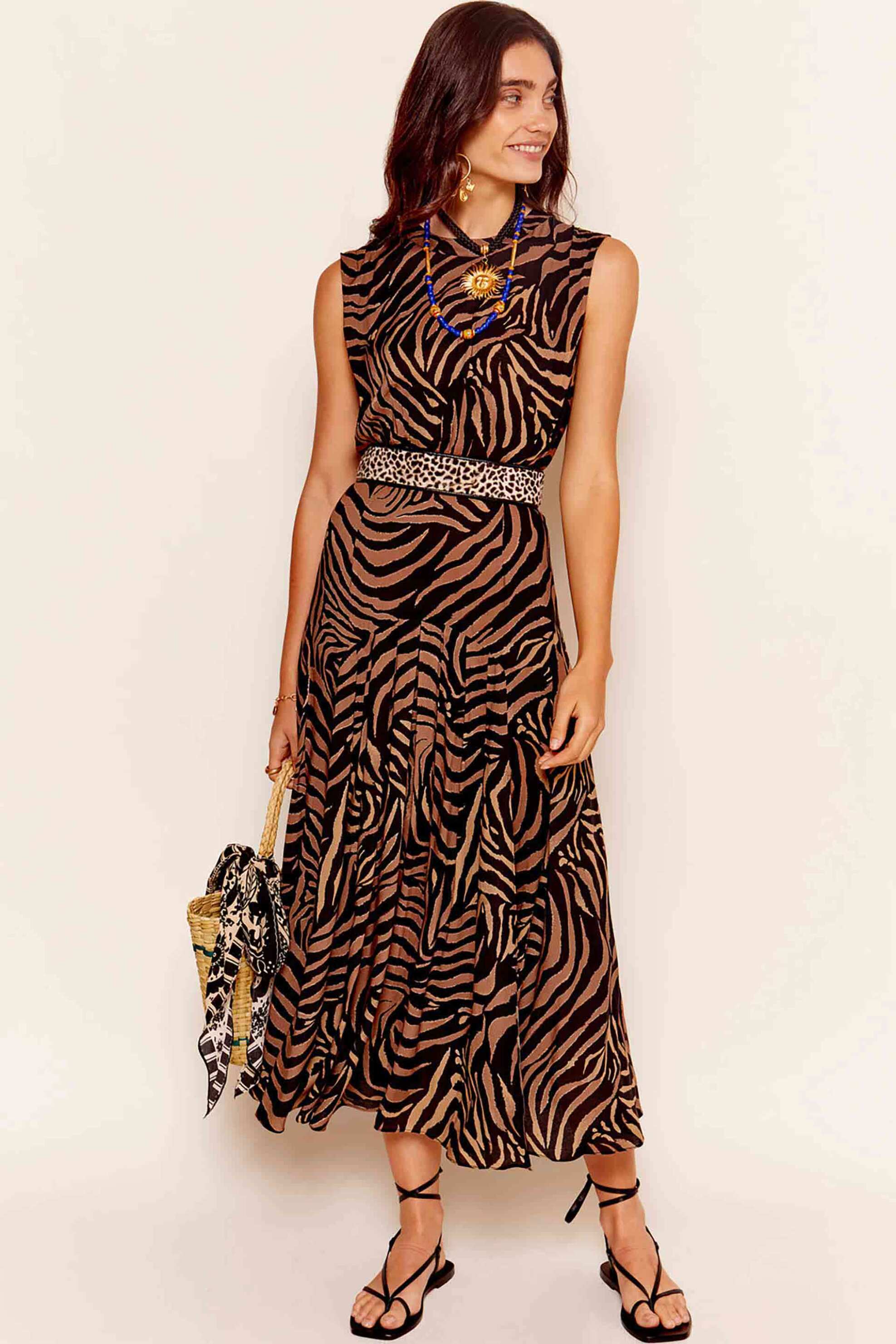 Γυναικείο midi φόρεμα. Tiger print. Kλειστή λαιμόκοψη. Αμάνικο. Flare κάτω μέρος. 100% βισκόζη