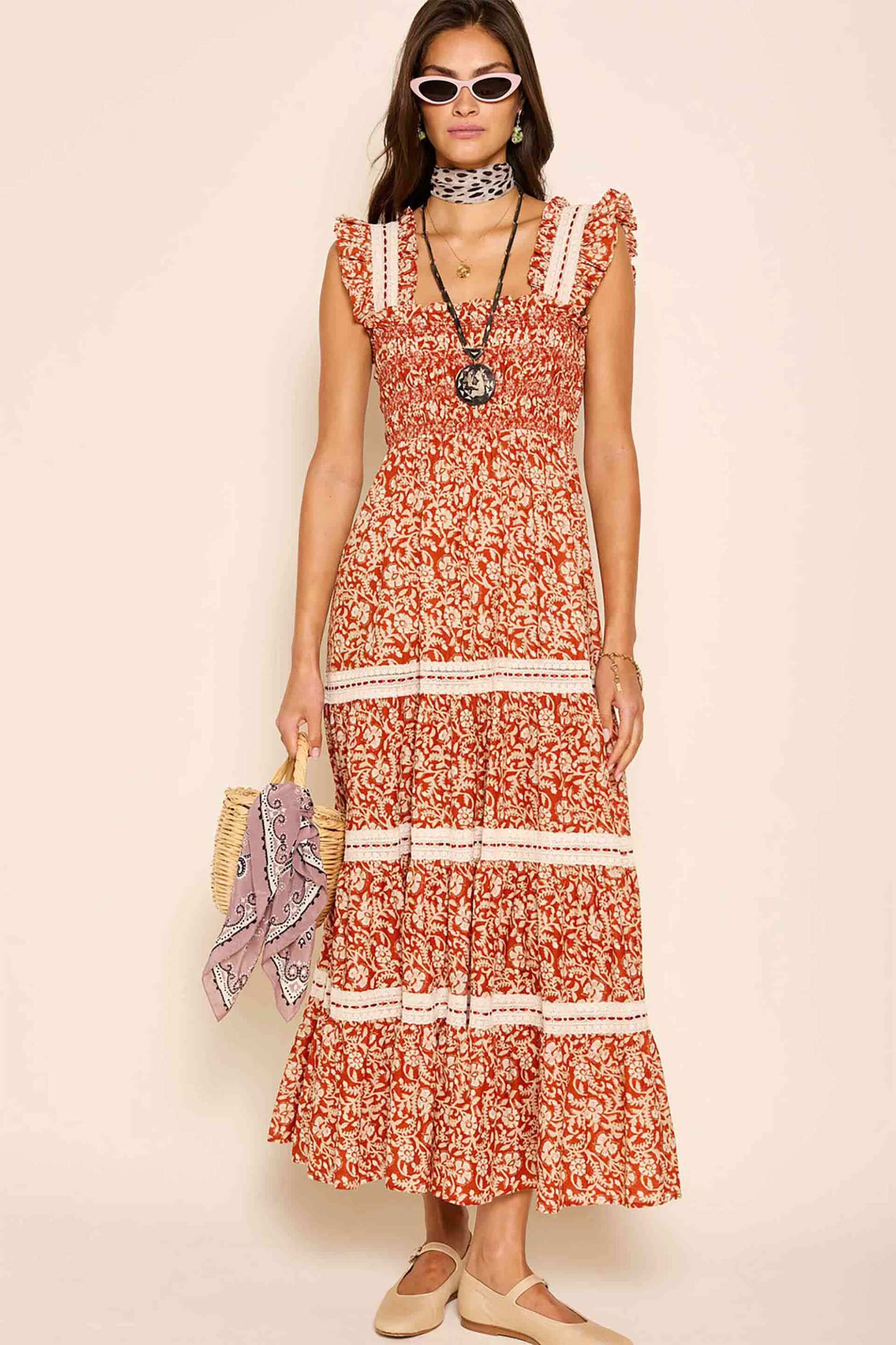 Γυναικείο midi φόρεμα. All-over floral print. Kαρέ λαιμόκοψη. Φαρδιές τιράντες με δαντέλα. 100% βαμβάκι