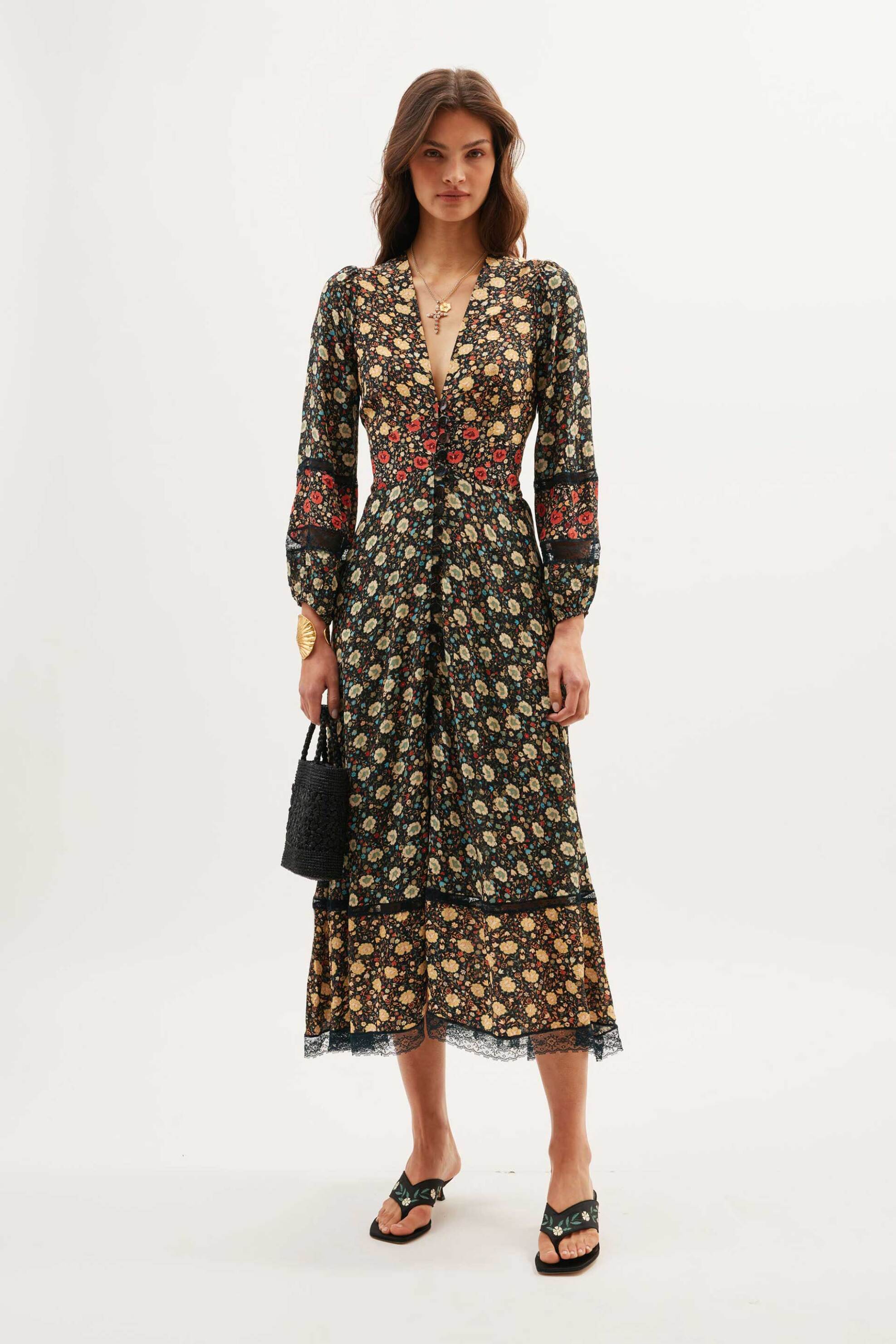 Γυναικείο midi φόρεμα. All-over floral print. V λαιμόκοψη. Λεπτομέρεια με κουμπιά. Μακρύ μανίκι balloon με λεπτομέρεια από δαντέλα. Προέλευση: CN. 100% βισκόζη RIXO LTD
