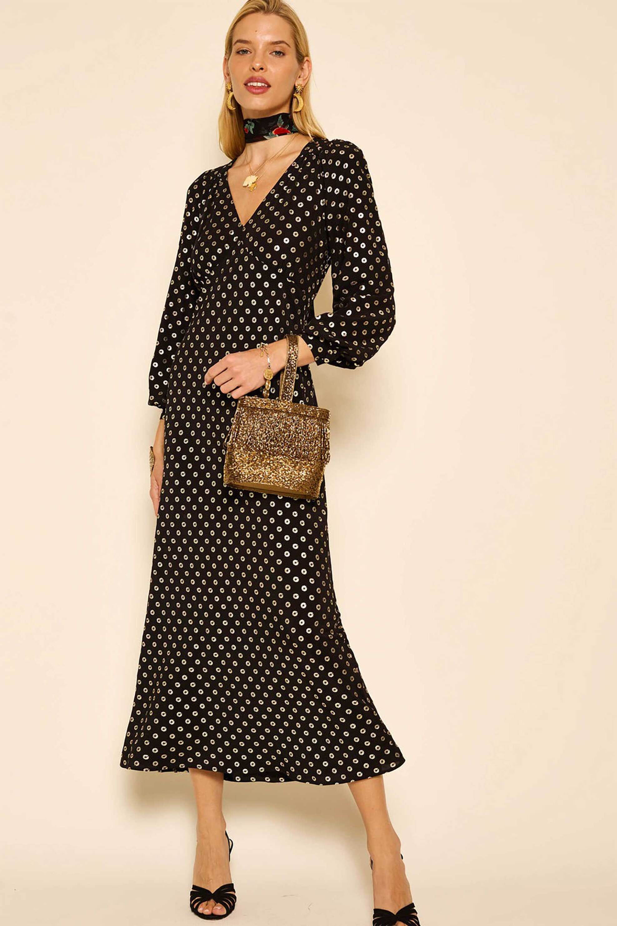 Γυναικείο midi φόρεμα. Πουά print. V λαιμόκοψη. Μακρύ μανίκι. 100% βισκόζη Το μοντέλο είναι 178 cm και φοράει νούμερο UK8