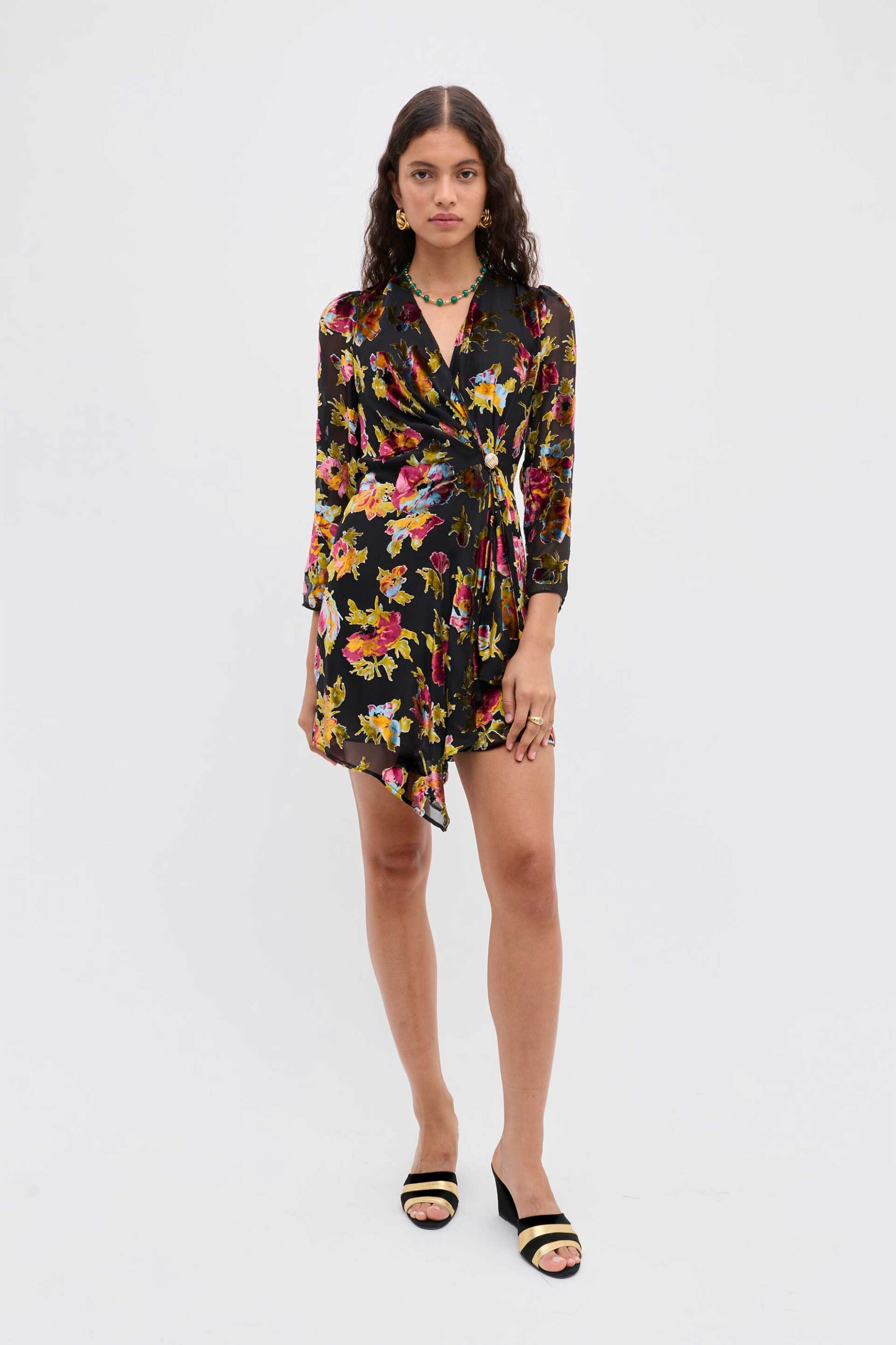 Γυναικείο mini φόρεμα. Velvet. All-over floral print. V λαιμόκοψη. Mανίκι 3/4. Xρυσή λεπτομέρεια μπροστά. Προέλευση: CN. 72% βισκόζη, 28% μετάξι RIXO LTD